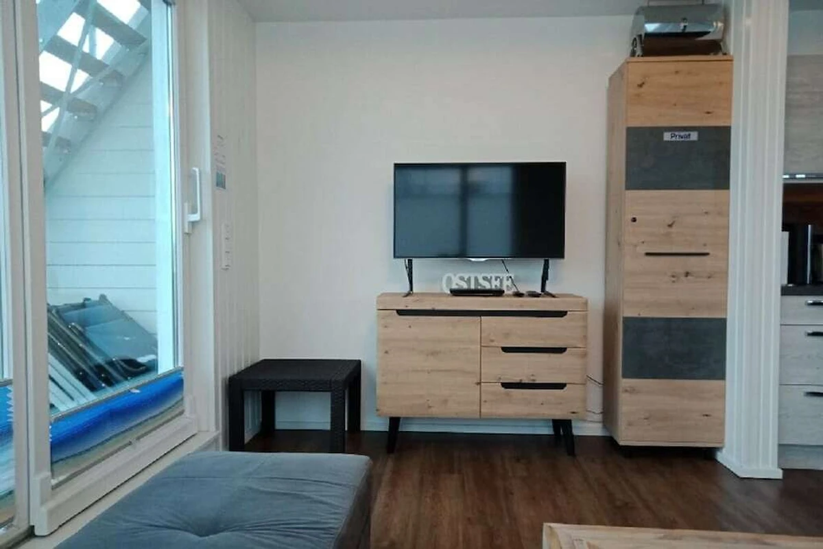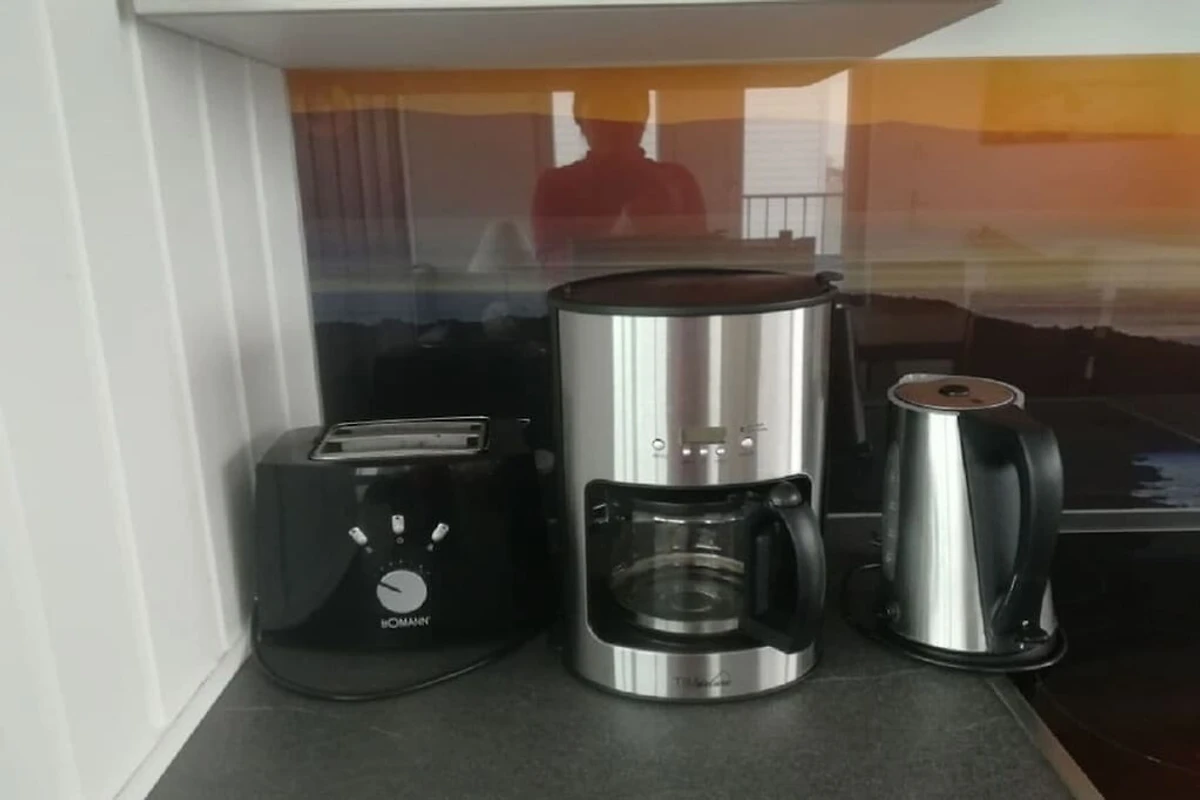 In der 1. Etage: (offene Küche(Kochnische, Schlafcouch 1 Pers., TV, Esstisch, Radio, CD-Spieler, Kochplatte, Wasserkocher, Toaster, Kaffeemaschine, Backofen, Mikrowelle, Spülmaschine, Kühlschrank, Tiefkühlschrank, Waschmaschine, Heizung, Hochstuhl, ))