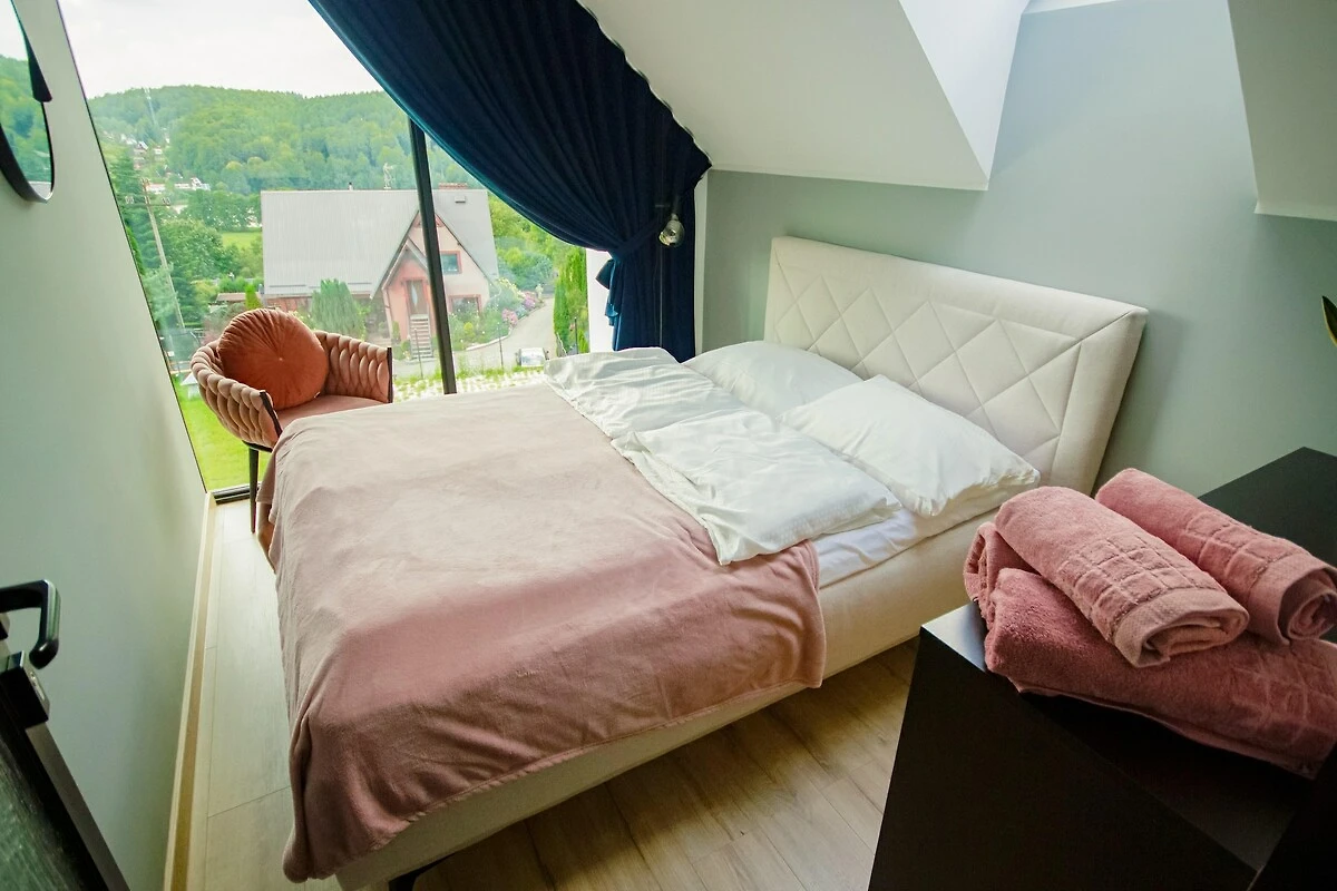Ein modernes und komfortables Ferienhaus im Herzen der malerischen Kaschubei, im Dorf Krzeszna. Hoch oben auf einem Hügel gelegen, bietet es einen Panoramablick auf die umliegenden Wälder sowie die Seen Ostrzyckie und Patulskie. Die Abgeschiedenheit von der Hauptstraße garantiert Ruhe und Erholung inmitten der Natur. Das Ferienhaus besticht durch eine hochwertige Ausstattung, große Fensterflächen und ein gemütliches Interieur mit Kamin. Gästen stehen ein gepflegter, umzäunter Garten, ein Grill mit Feuerstelle, ein Parkplatz und Breitband-Internetzugang zur Verfügung. Gegen eine Gebühr (300 PLN für den ersten Tag, 100 PLN für jeden weiteren Tag) können Gäste den Whirlpool mit Jacuzzi nutzen. Im Vergleich zu anderen Unterkünften in der Gegend zeichnet sich das Haus durch seine einzigartige Lage aus – fernab von Nachbarn, was absolute Privatsphäre und ungestörte Entspannung garantiert.