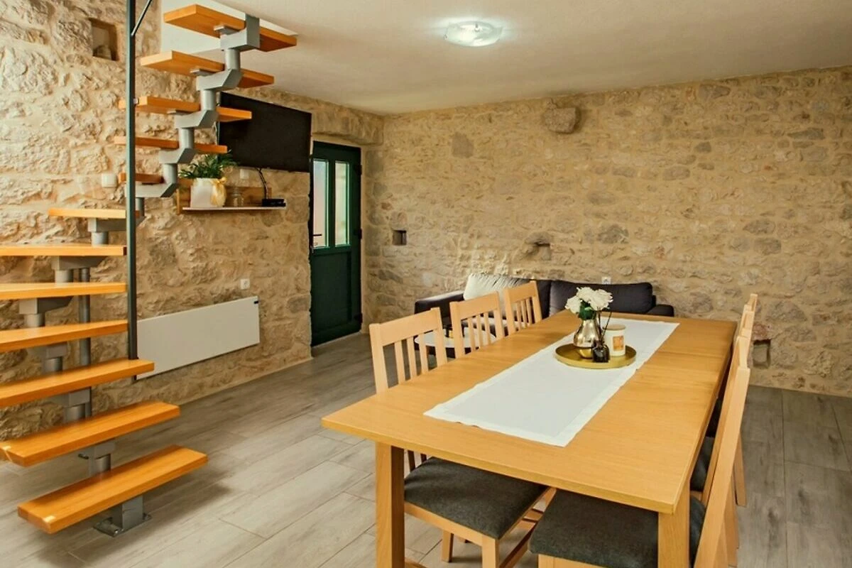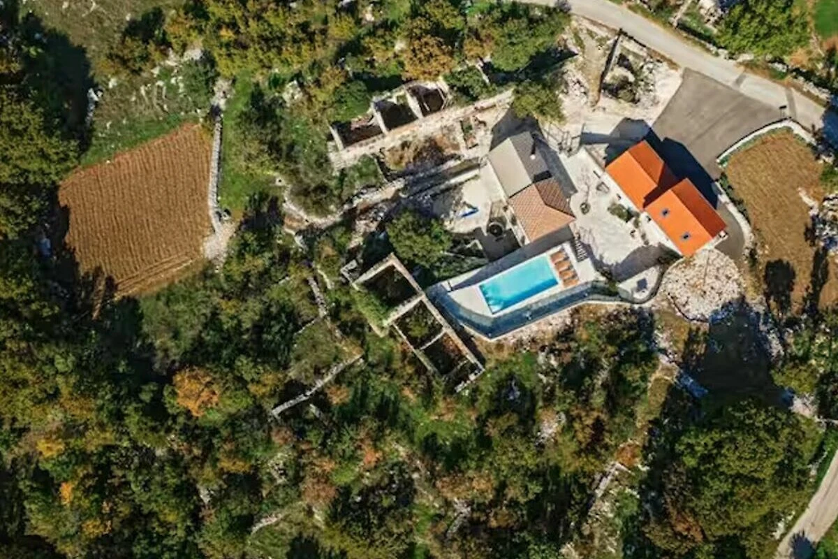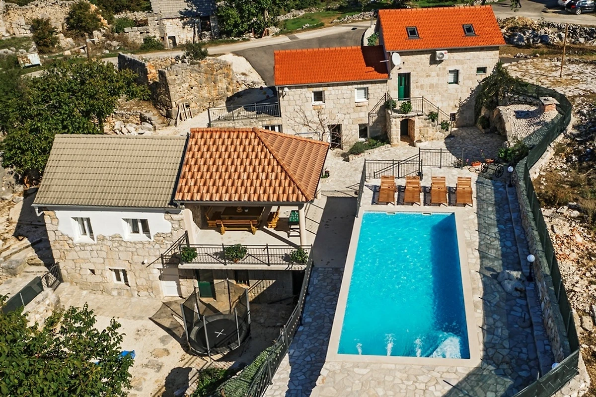 Dieses traditionelle dalmatinische Steinhaus ist komplett ausgestattet für einen gemütlichen Urlaub. Während der Sommermonate steht Ihnen ein schöner 38 m² großer Außenpool fur Erfrischung zur Verfügung. Während Sie beim Grill beschäftigt sind, können sich Ihre Kinder auf dem Spielplatz spielen. Das ganze Anwesens mit drei Hauser, dem Pool und mit einem überdachten Essbereich im Freien ist fur private Nutzung der Gaste. Diese drei klimatisierte Hauser bestehen aus zwei Wohn- und Esszimmern, einer Küche, vier Schlafzimmern und vier Badezimmern.