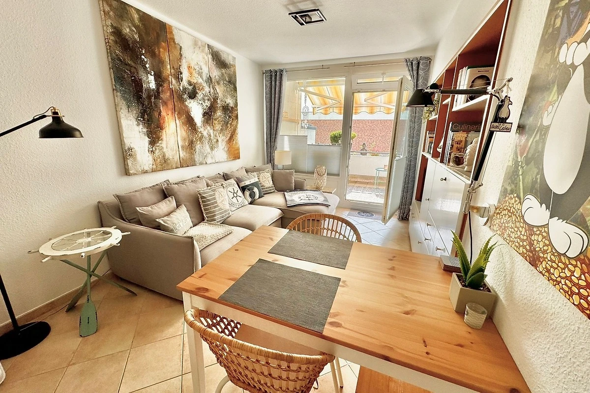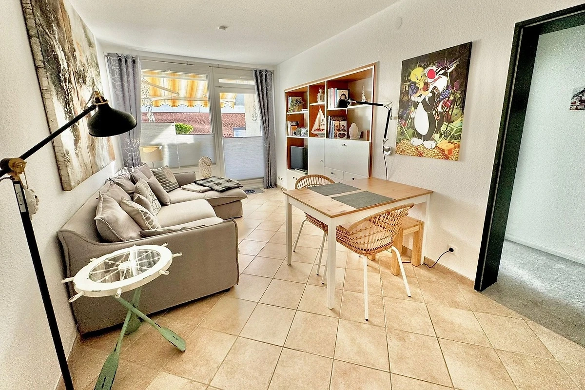 Der helle Wohnbereich mit Esstisch für 4 Personen, gemütlichem Sofa und Wohnwand mit Flachbildfernseher führt direkt auf den sonnigen und windgeschützten süd-west- Balkon mit seitlichem Meerblick – ein idealer Ort, um die frische Meeresluft zu geniessen.