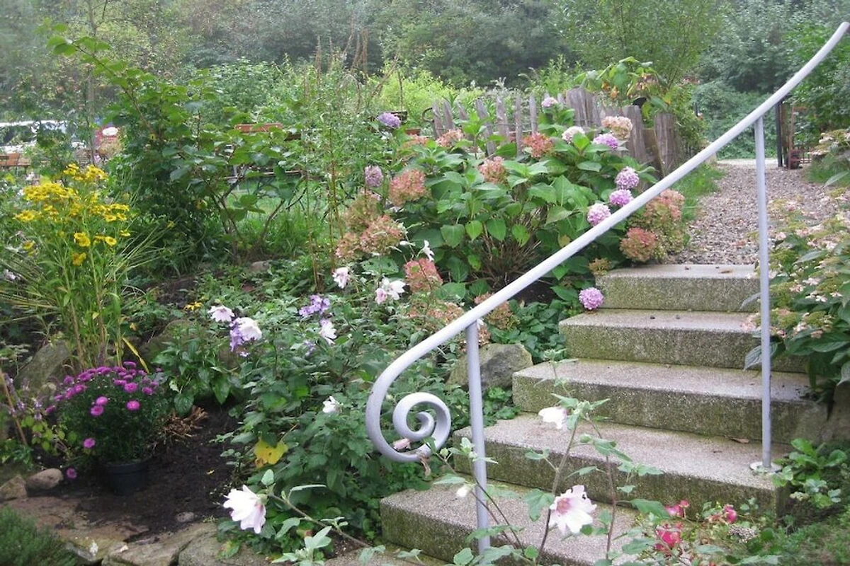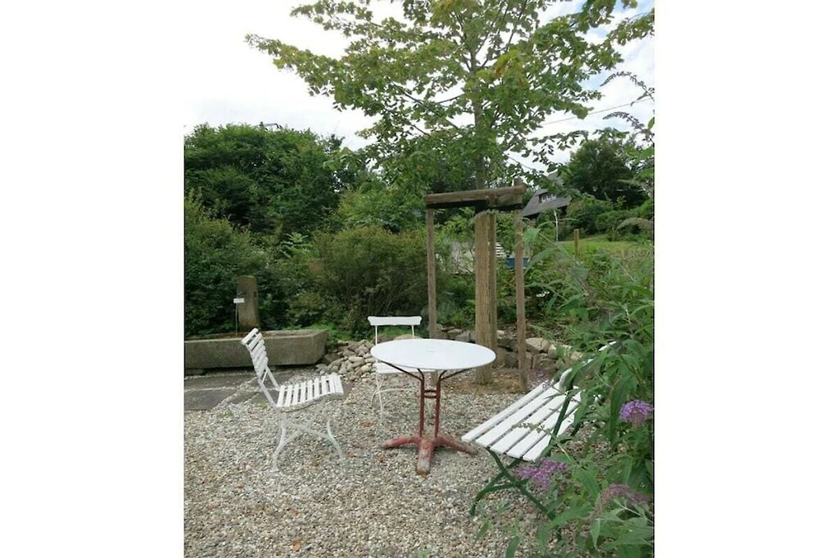 Vor dem Haus zur Sackgassenstraße liegt eine eingewachsene Terrasse. Auf der Wiese, einem Teil des ehemaligen Kaffeegartens , sowie am plätschernden Brunnen können Sie Erholung und Entspannung finden.