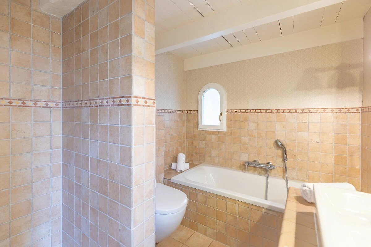 Das moderne Badezimmer verfügt über eine bodengleiche Dusche, eine Badewanne, Fenster, Waschbecken, Spiegel, WC sowie einen Haartrockner. Zusätzlich steht ein separates Gäste-WC zur Verfügung.