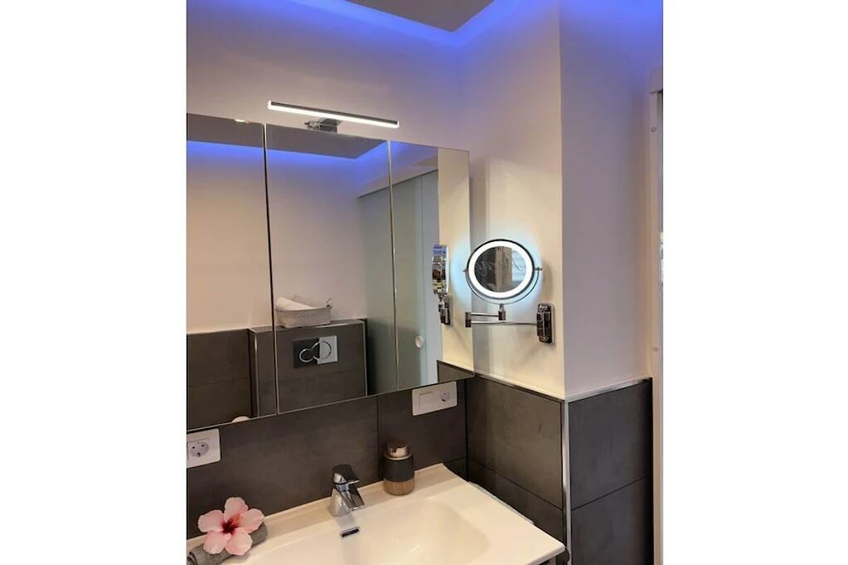 Ein besonderes Highlight sind die stimmungsvollen Lichtinstallationen an Decke und Bett, die mit wechselnden Farben für romantische Abende oder gemütliche Stunden sorgen.