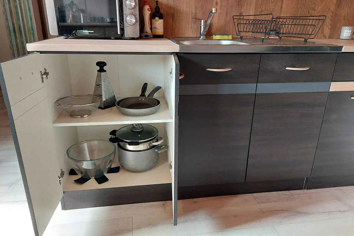 Wohnzimmer mit 2 Zusatzbetten auf Doppelausziehcouch und TV. Schlafzimmer mit 1 Doppelbett. Schlafzimmer mit 1 Doppelbett und TV. Küche mit Elektroherd (4 Platten), Backofen, Geschirrspüler, Kühlschrank (160 l, Eisfach), Mikrowelle, Kaffeemaschine und elektrischem Wasserkocher. Bad mit Dusche, 1 Waschbecken und WC.