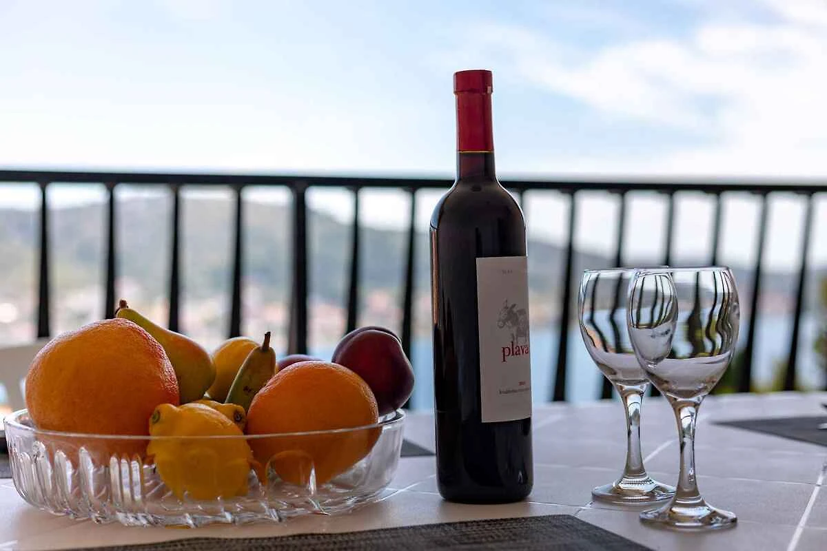 Die Ferienwohnung befindet sich in einem Apartementhaus und ist modern eingerichtet. Auch wegen des Ausblicks vom Grundstück auf das Meer und der ruhigen und sonnigen Hanglage ist das Domizil beliebt. Zur gemeinsamen Nutzung stehen zur Verfügung: Terrasse, Gartenmöbel und Hof.