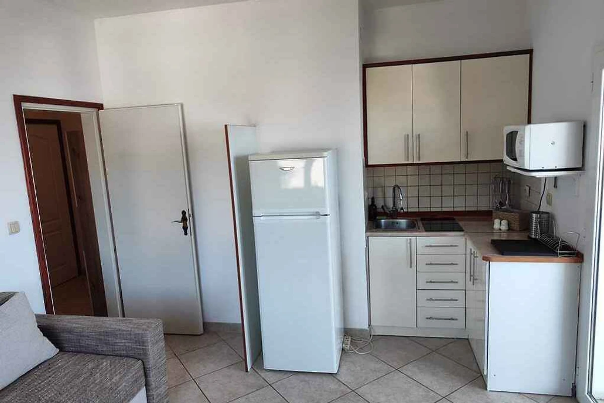und führt über eine Aussentreppe direkt in das Wohnzimmer. Wohnzimmer mit 2 Zusatzbetten auf Couch/Sofa, Sitzecke, TV, (4 Plätze) und Zugang zum Balkon (überdacht, Gartenmöbel, 1 Tisch, 4 Stühle, Sonnenschirm). Schlafzimmer mit 1 Doppelbett und Zugang zum Balkon (gemeinsam mit Aufenthaltsraum). Küche in der Wohnküche mit Essecke (4 Plätze), Elektroherd (2 Platten), Kühlschrank (Eisfach), Mikrowelle, elektrischem Wasserkocher und Zugang zum Balkon. Bad mit Dusche, 1 Waschbecken und WC.