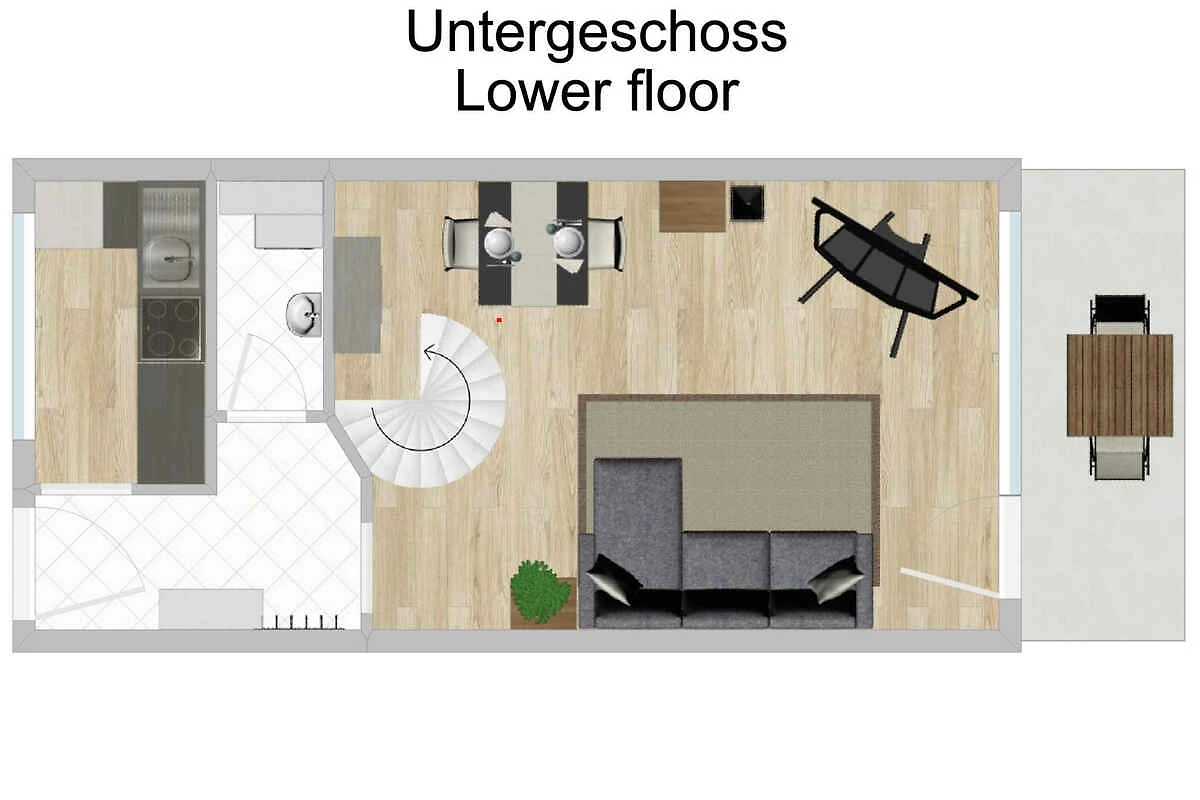 Ferienwohnung, 2 Etagen, 2 Zimmer (davon 1 Schlafzimmer), 50 qm, insgesamt 4 Betten (davon 2 Zusatzbetten).
