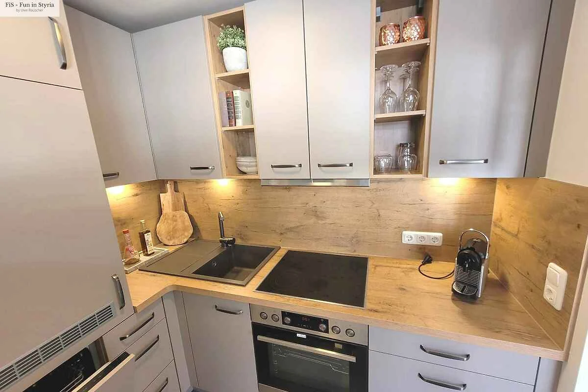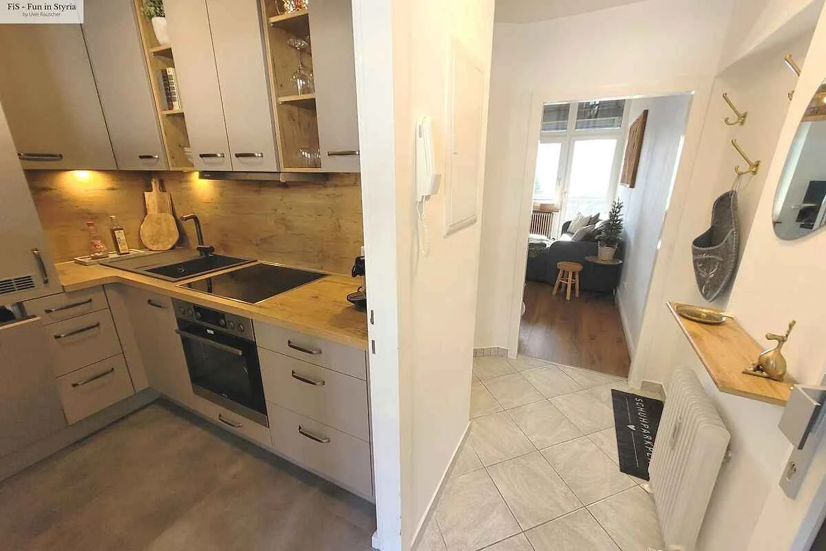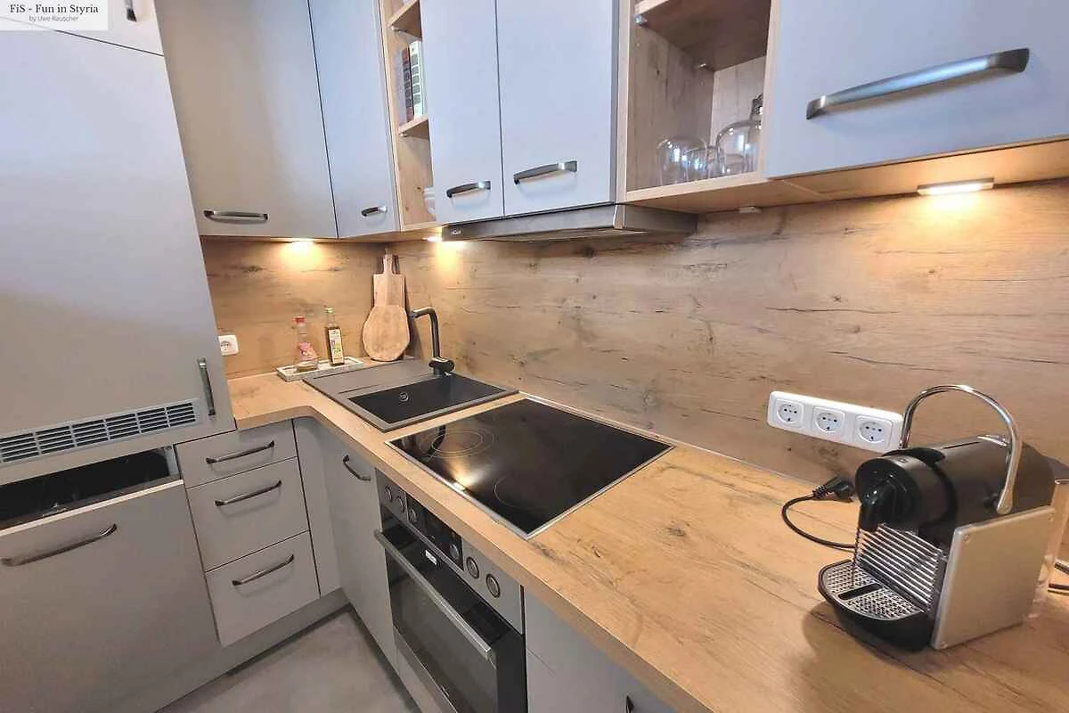 Untergeschoss: Wohn/Schlafzimmer (20 qm, Durchgangszimmer) mit 2 Zusatzbetten auf Doppelausziehcouch, Sitzecke, TV, Essecke (4 Plätze) und Zugang zum Balkon. Küche (10 qm, nicht beheizbar) mit Elektroherd (4 Platten), Backofen, Dunstabzugshaube, Geschirrspüler, Kühlschrank (Eisfach), Kaffeemaschine, Kapselmaschine, Toaster und elektrischem Wasserkocher. Abstellraum im Flur (5 qm, nicht beheizbar) mit Waschmaschine.