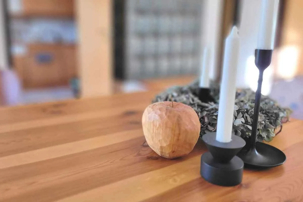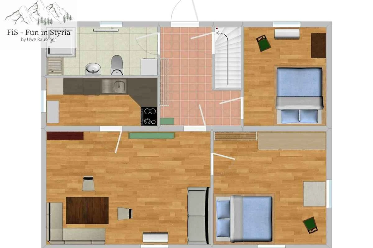 Hochparterre: Wohnzimmer (10 qm, Durchgangszimmer) mit Sitzecke, Kachelofen und Essecke (4 Plätze). 2 Schlafzimmer jeweils (10 qm) mit 1 Doppelbett. Küche (5 qm) mit Elektroherd (4 Platten), Backofen, Dunstabzugshaube, Geschirrspüler, Kühlschrank, Mikrowelle, Kaffeemaschine, Toaster und elektrischem Wasserkocher. Bad (5 qm) mit Waschmaschine, Wäschetrockner, Dusche, 1 Waschbecken, Föhn und Fenster.