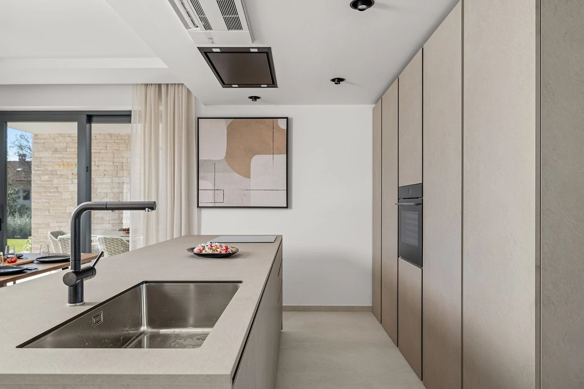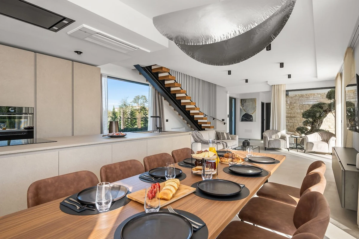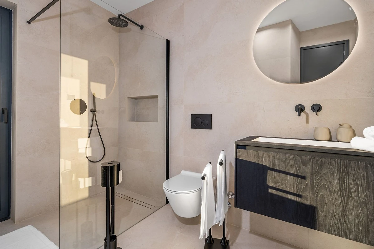 Die Villa verfügt über beeindruckende 5 Badezimmer, von denen 4 mit modernen Duschen und einer zusätzlichen Toilette ausgestattet sind, was Komfort und Bequemlichkeit für alle Gäste gewährleistet. Das Herzstück des Hauses ist die amerikanische Küche, die vollständig mit hochwertigen Geräten ausgestattet ist, darunter ein Induktionsherd, Kühlschrank, Gefrierschrank, Backofen, Mikrowelle, Geschirrspüler, Kaffeemaschine und essentielles Küchengeschirr.