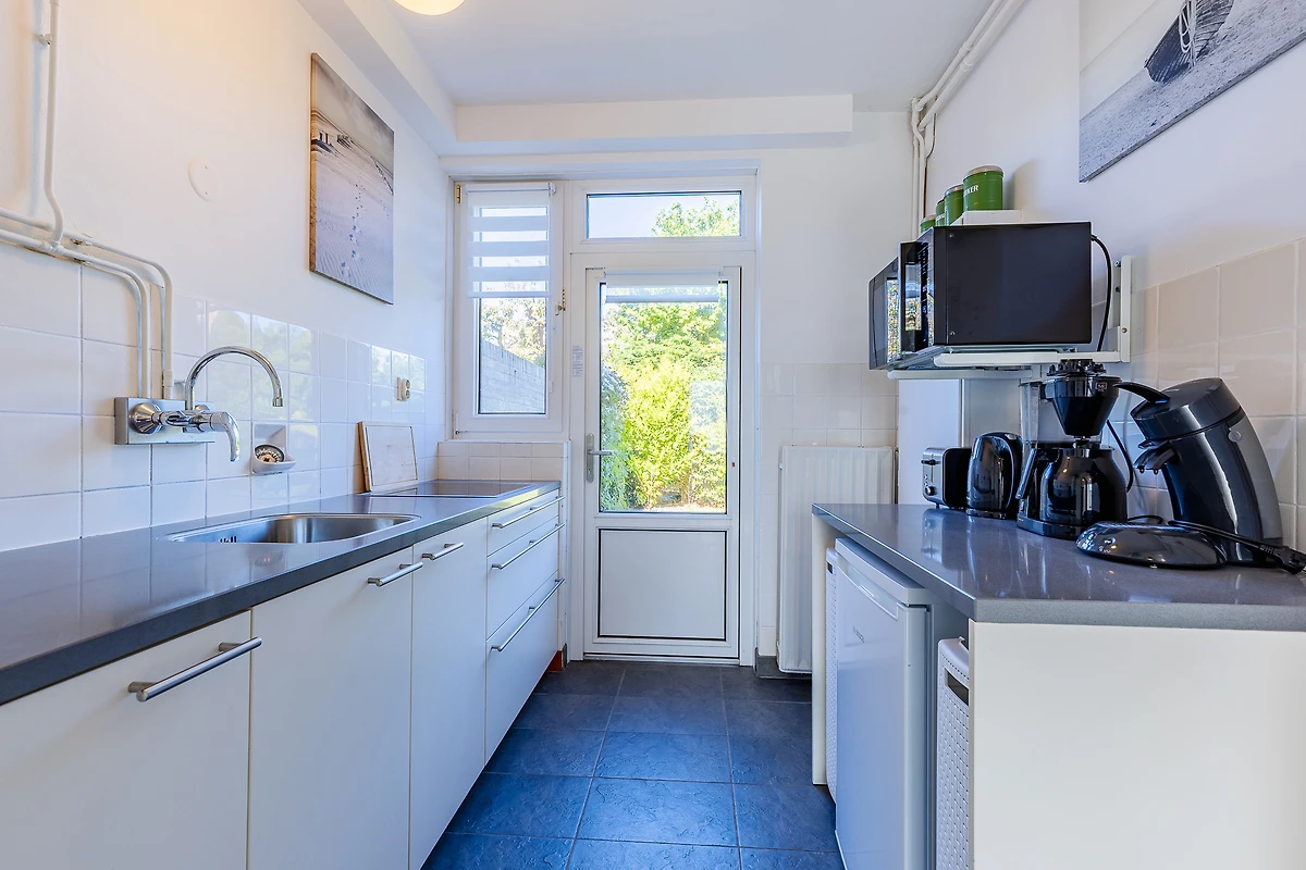 Die offene Küche ist mit einer hochwertigen Küchenzeile, Geschirrspüler, Mikrowelle, Wasserkocher und Kaffeemaschine bestens ausgestattet, sodass Sie jederzeit gemeinsam kochen und genießen können. Für Unterhaltung sorgt ein Fernseher im Wohnbereich, während Ihnen kostenfreies WLAN im gesamten Haus zur Verfügung steht. Die Waschmaschine ermöglicht unkomplizierte Wäschepflege während Ihres Aufenthalts.