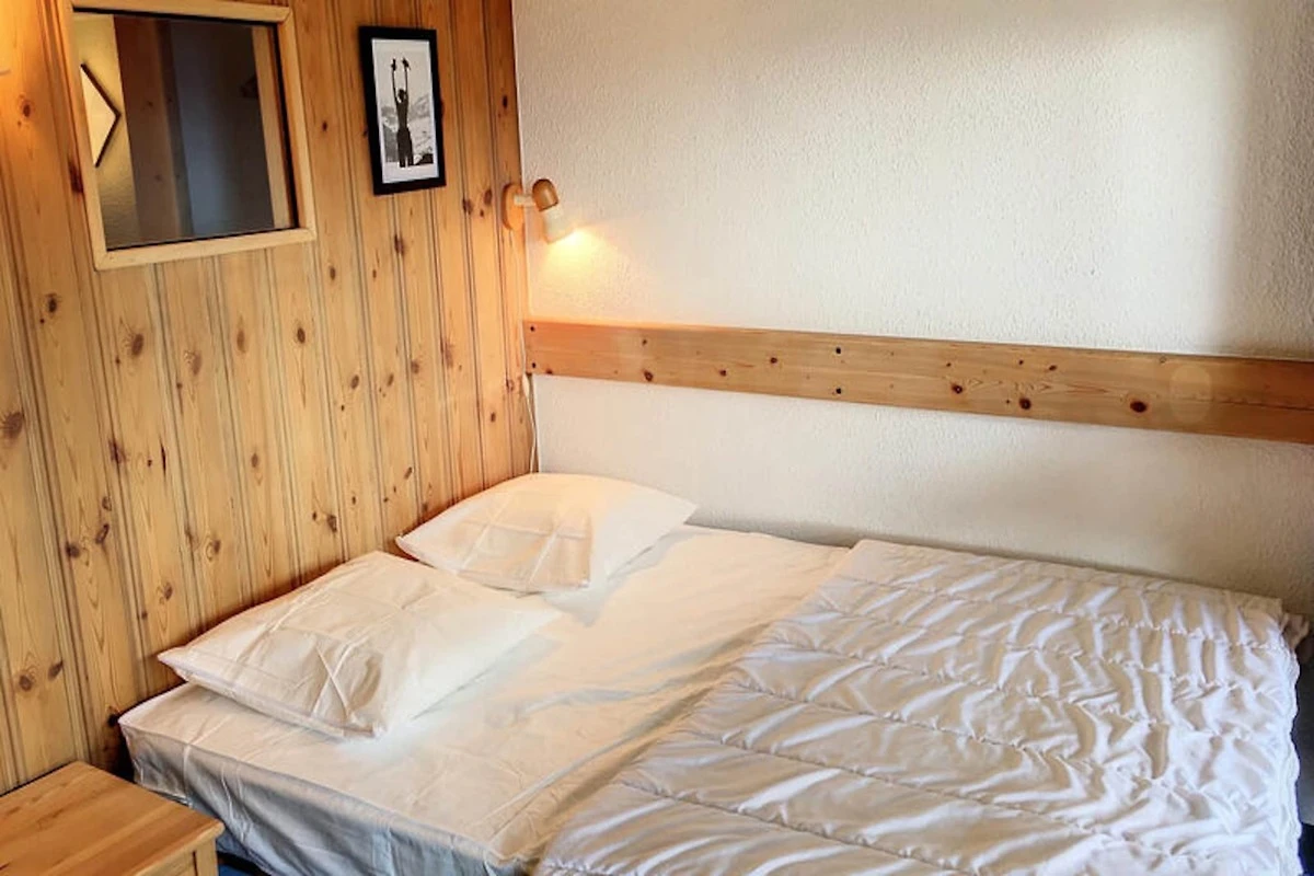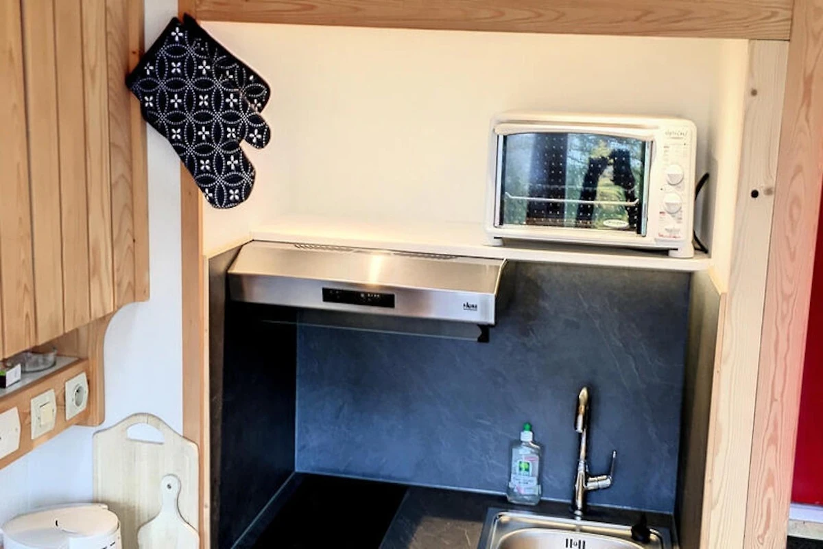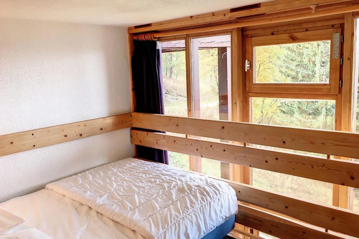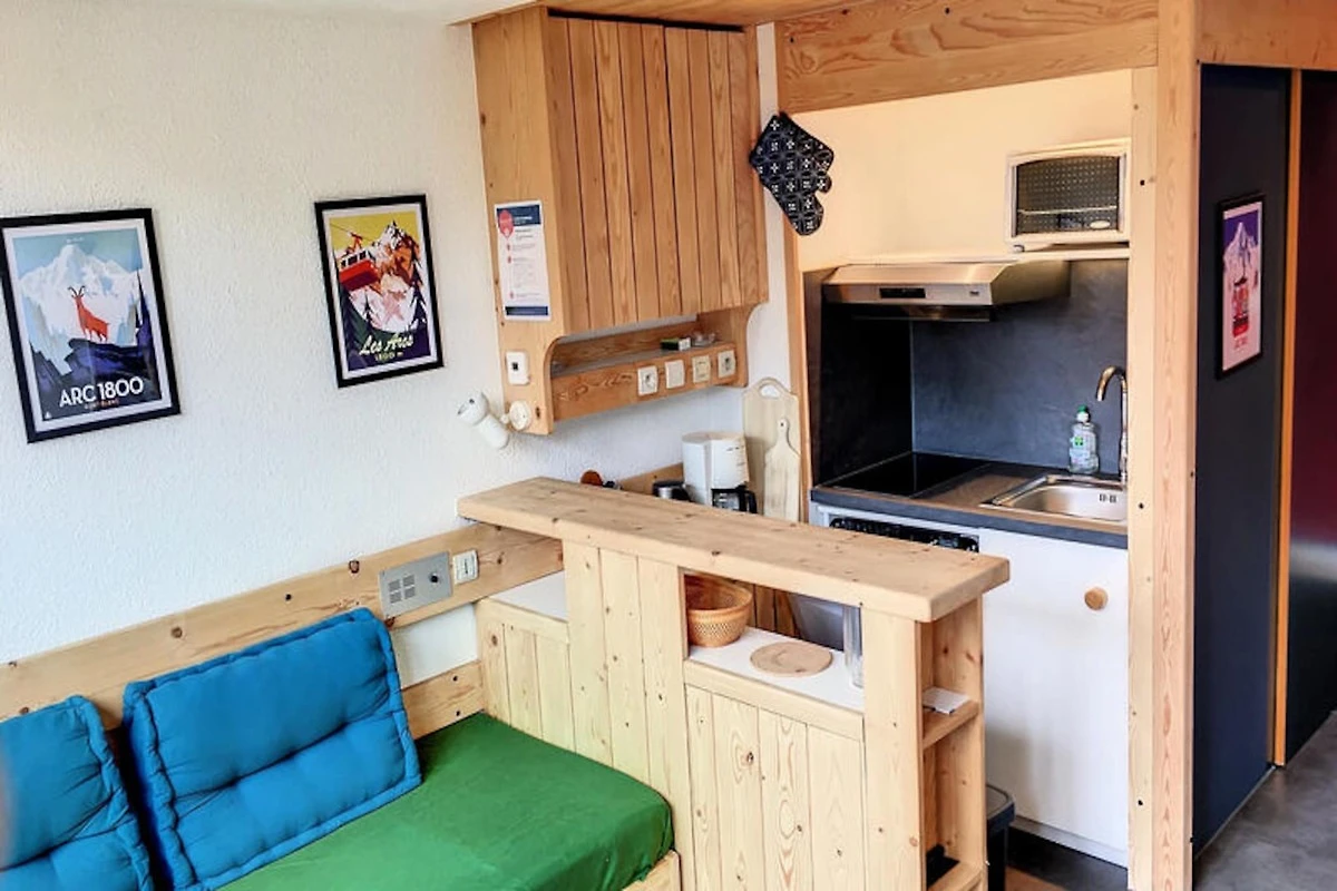 Das Apartment ist durchdacht gestaltet und bietet Platz für bis zu vier Gäste. Vom Eingangsbereich gelangen Sie in ein Badezimmer mit Badewanne und WC. Die voll ausgestattete Küchenzeile verfügt über drei elektrische Kochplatten, einen Backofen, einen Kühlschrank und einen Geschirrspüler – perfekt, um nach einem Tag auf der Piste leckere Mahlzeiten zuzubereiten. Das Wohnzimmer mit Esstisch und bequemer Sitzbank bietet einen einladenden Ort zum Entspannen. Im Obergeschoss bietet die Galerie zwei versetzt angeordnete Einzelbetten, eine gemütliche Entspannungsecke mit Sessel und Fernseher. Ein separates Schlafzimmer mit Doppelbett sorgt für erholsame Nächte.