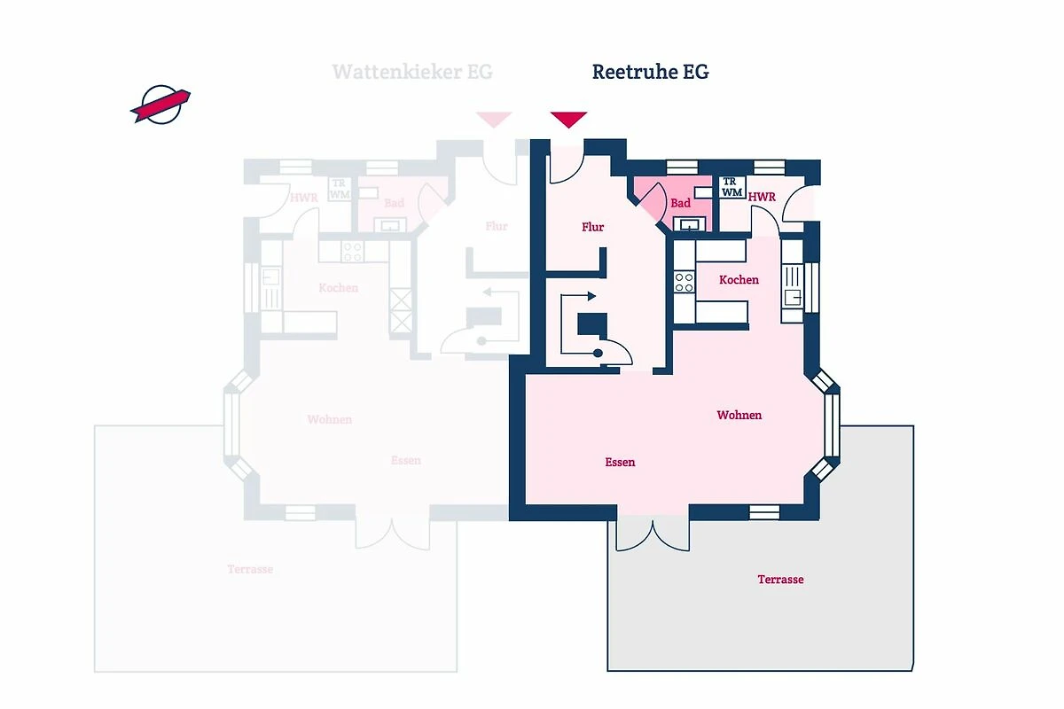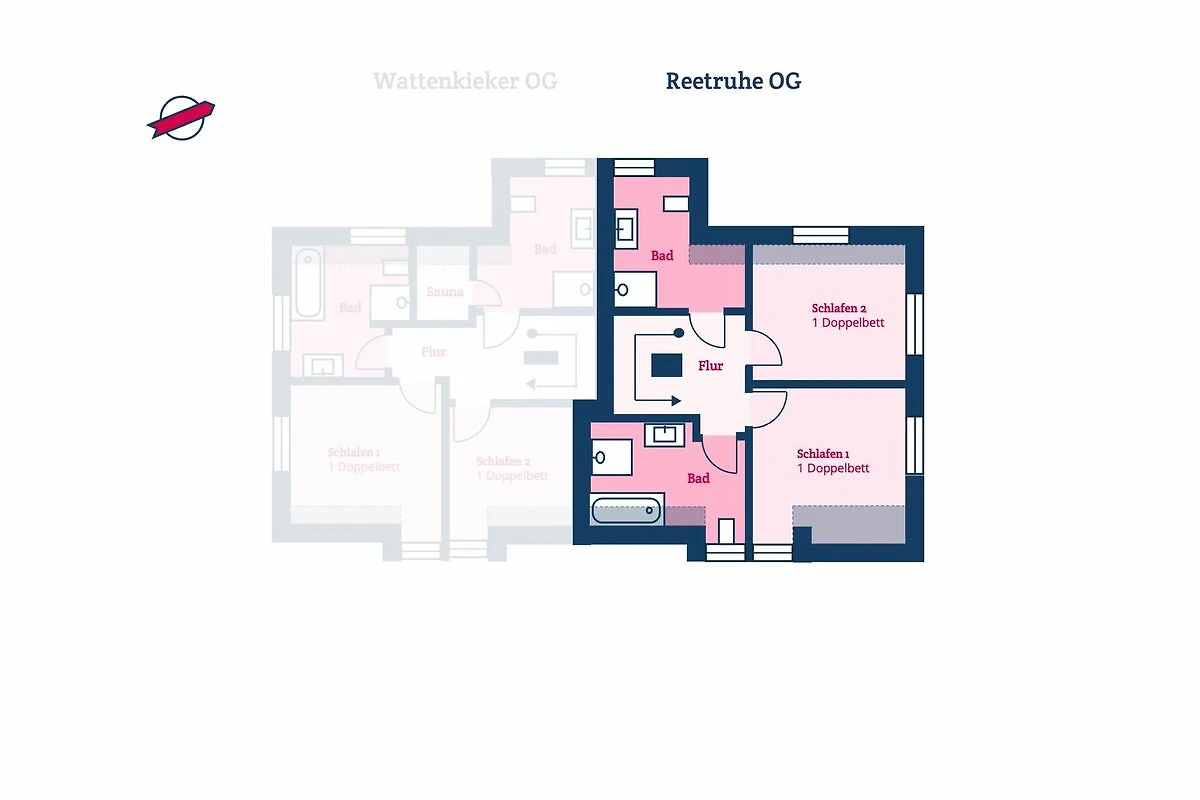 Die reetgedeckte Ferienhaushälfte Reetruhe verfügt über 2 Schlafzimmer, 2 Bäder und 1 Gäste-WC und bietet somit komfortabel Platz für bis zu 4 Personen zuzüglich einer Kleinkinderaufbettung. Auch bis zu 2 Hunde sind herzlich willkommen.