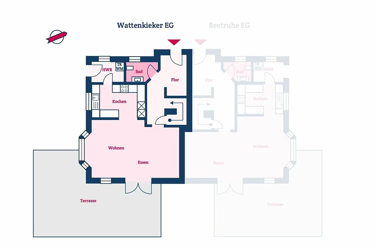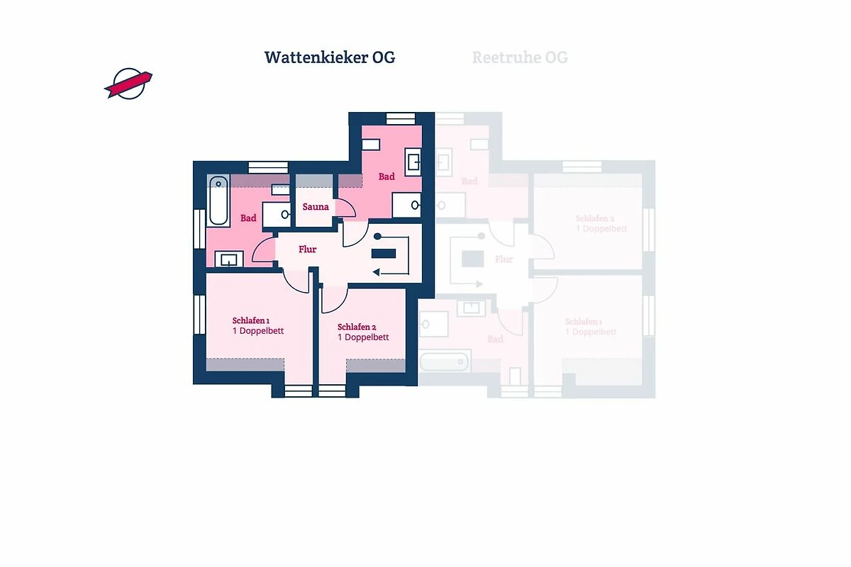 Die reetgedeckte Ferienhaushälfte Wattenkieker verfügt über 2 Schlafzimmer, 2 Bäder und 1 Gäste-WC und bietet somit komfortabel Platz für bis zu 4 Personen zuzüglich einer Kleinkinderaufbettung.
