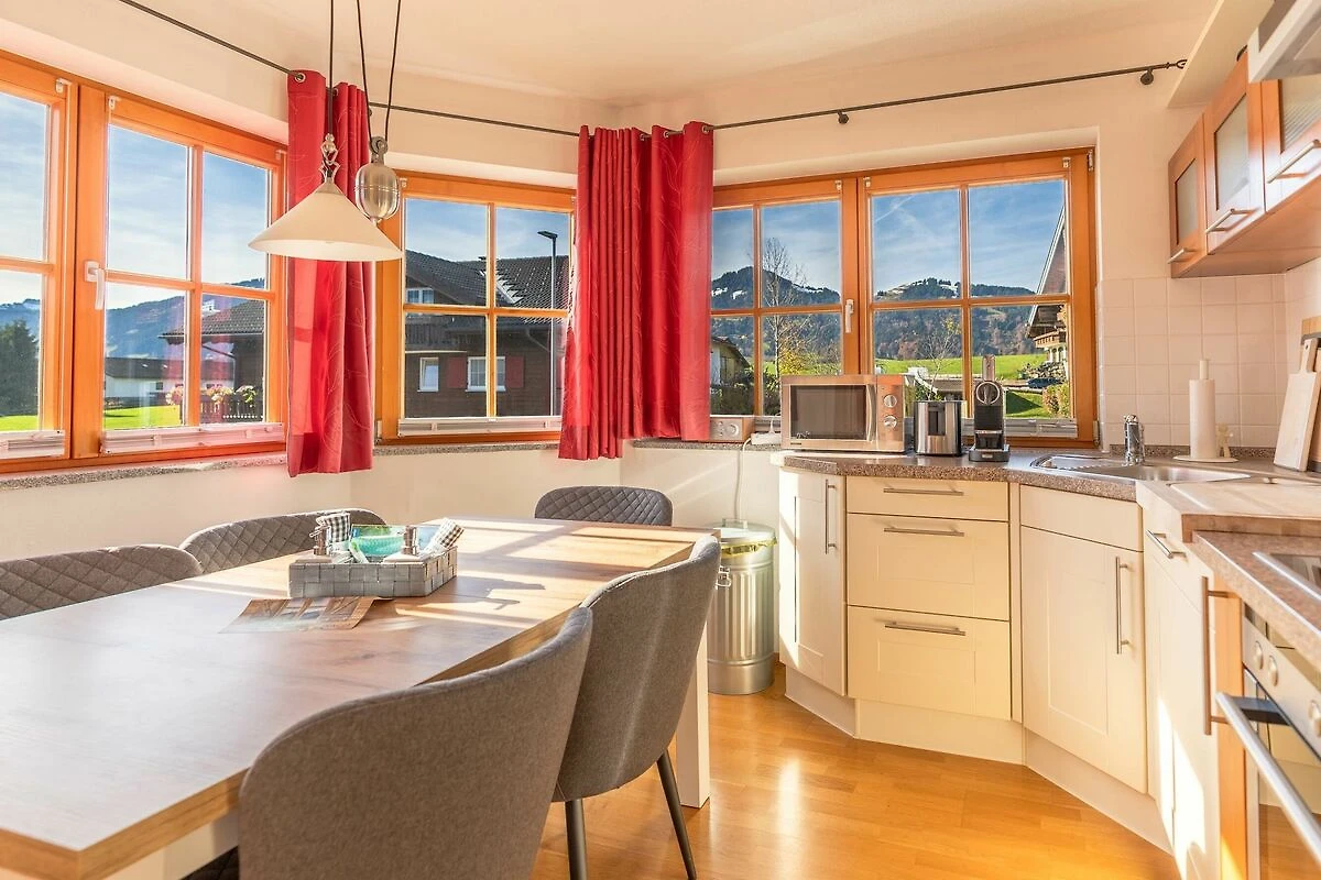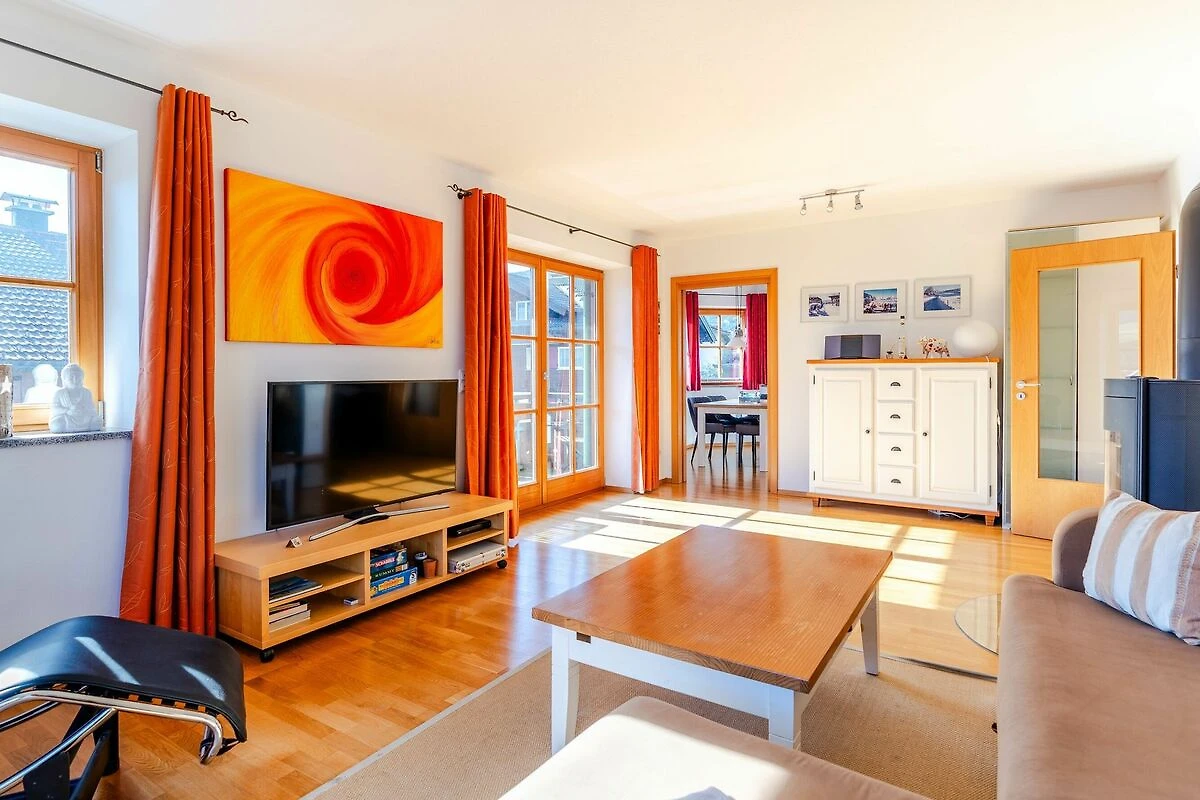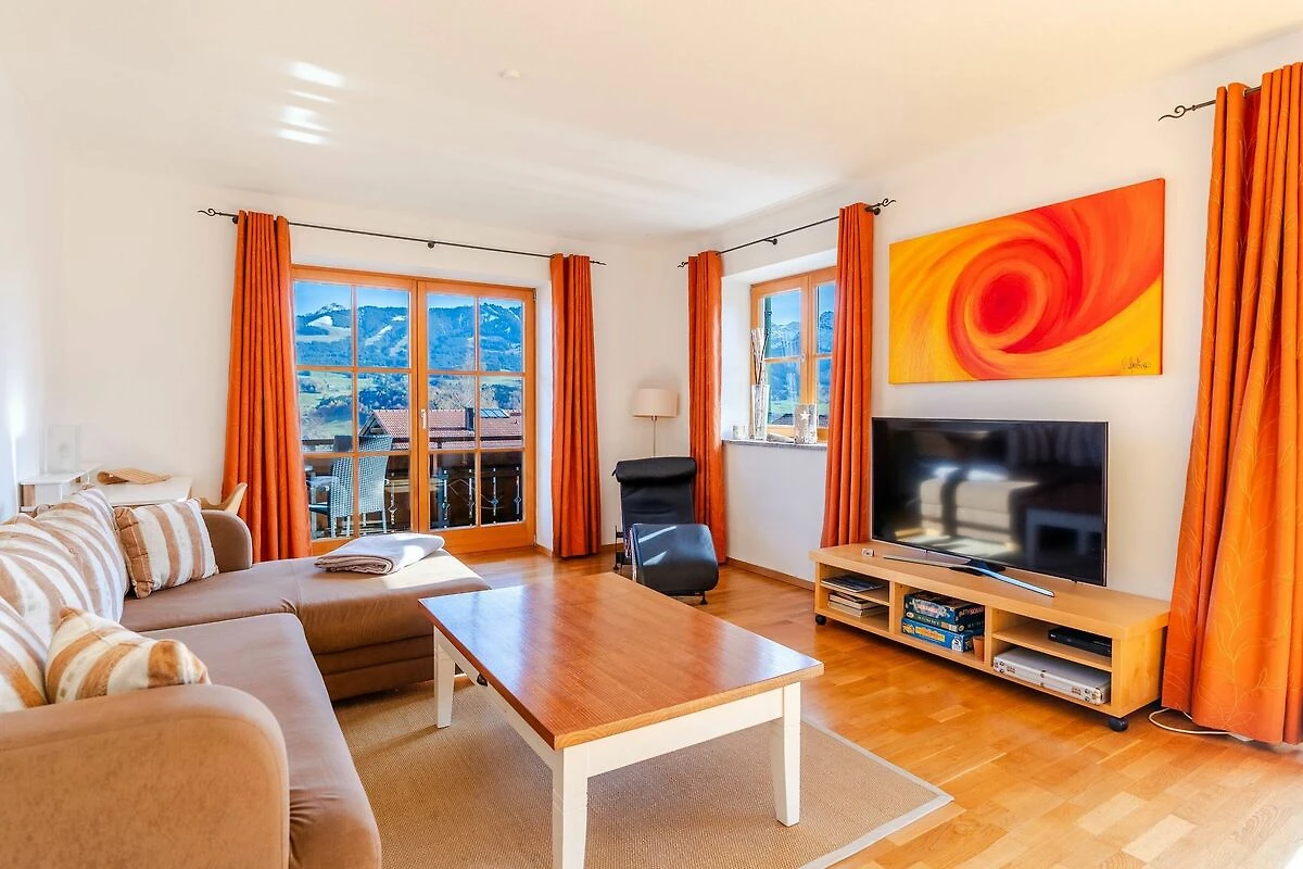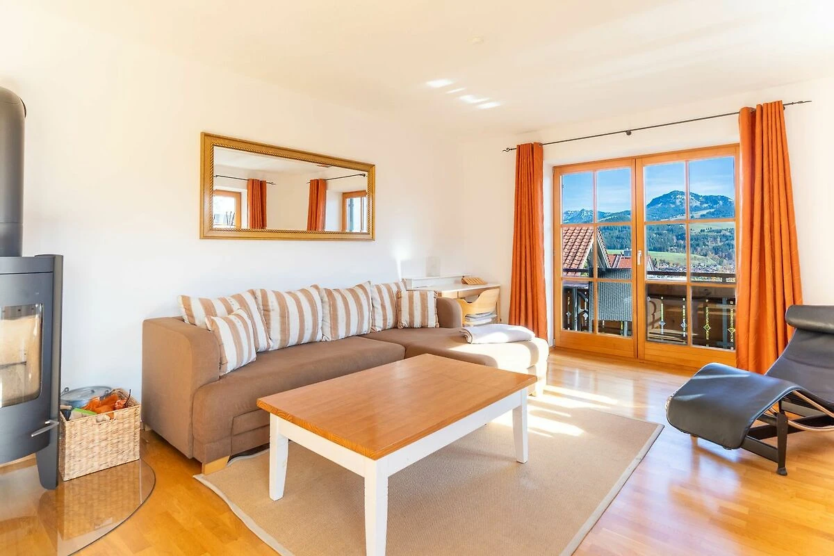 Diese liebevoll eingerichtete 3 Zimmerwohnung bietet Ihnen einen herrlichen Blick in die Allgäuer Berge und befindet sich im 1. OG eines Mehrfamilienhauses. Das Wohnzimmer ist mit einem gemütlichen Sofa, TV, einer Relaxliege und einem kleinen Schreibtisch ausgestattet.