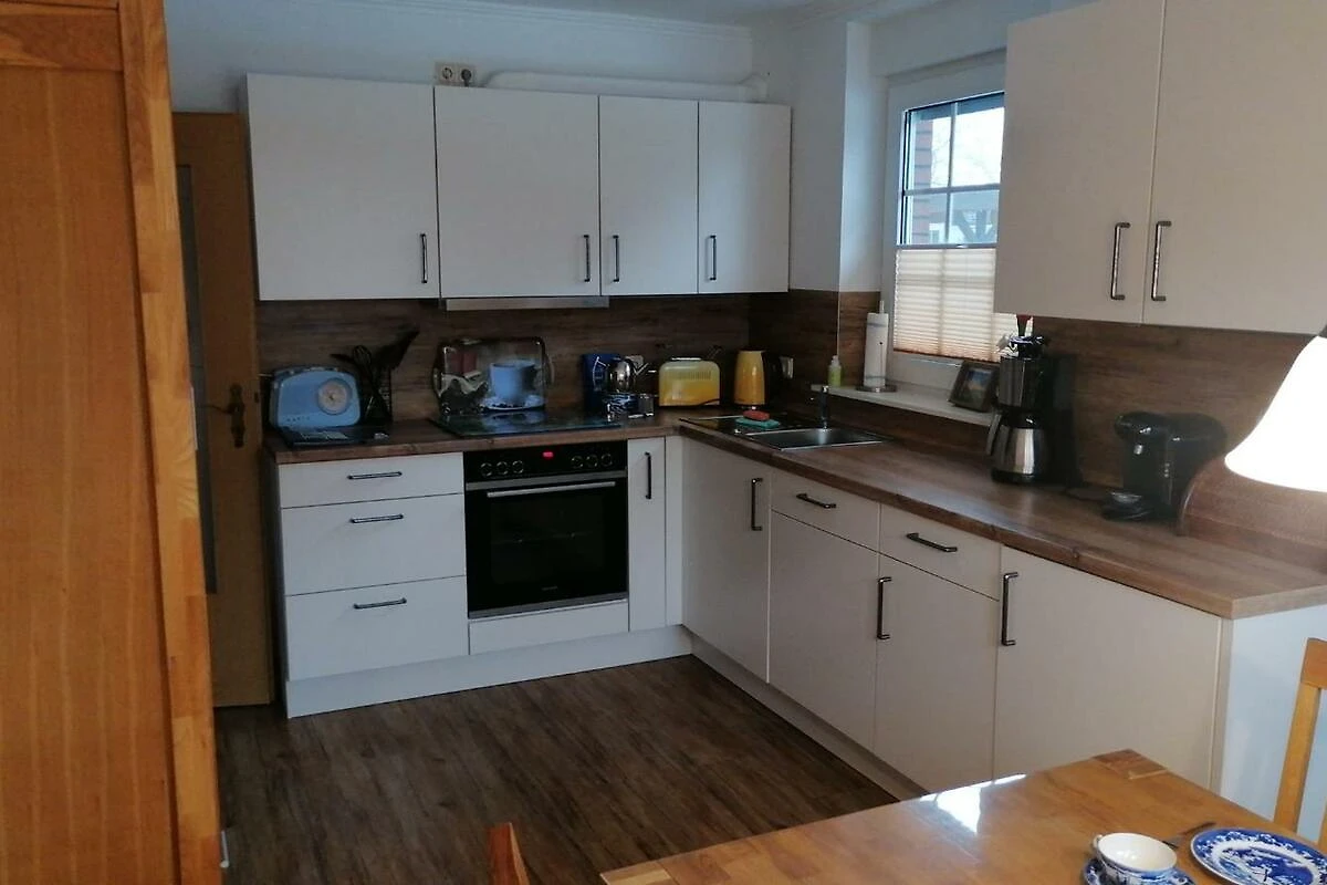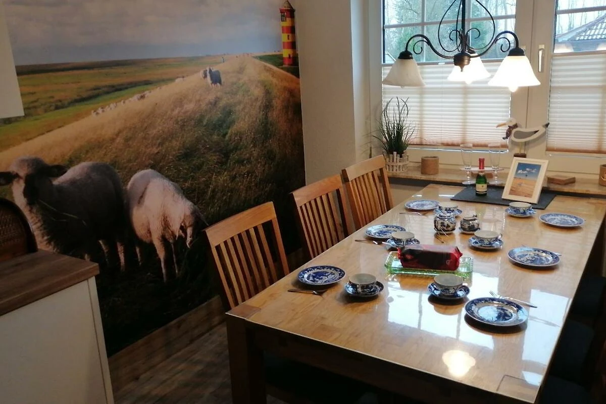 Willkommen in der Ferienwohnung FeWo Watt moi in Dornumersiel – Ihr perfektes Zuhause für einen entspannten Familienurlaub an der Nordseeküste Ostfrieslands. Auf 90 m² Wohnfläche finden bis zu 6 Gäste in drei behaglichen Schlafzimmern Platz, darunter ein liebevoll eingerichtetes Zimmer mit Etagenbett für Kinder. Das großzügige Wohnzimmer lädt mit Elektrokamin und Fußbodenerwärmung zu geselligen Abenden ein, während die moderne Küche mit Fußbodenerwärmung und 4-Platten-Keramikkochfeld, Backofen, Mikrowelle, Geschirrspüler, Kühlschrank, Gefrierfach, Kaffeemaschine, Tassimo, Wasserkocher, Toaster, Eierkocher und umfangreichem Geschirr keine Wünsche offenlässt. Das Badezimmer verfügt auch über eine Fußbodenerwärmung und einer Handtuchhalter Heizung . Eine Waschmaschine und ein Trockner - im Nebengebäude- gibt es beides gegen Gebühr. Bügeleisen, Bügelbrett, Staubsauger sowie ein Haartrockner stehen für Sie bereit.