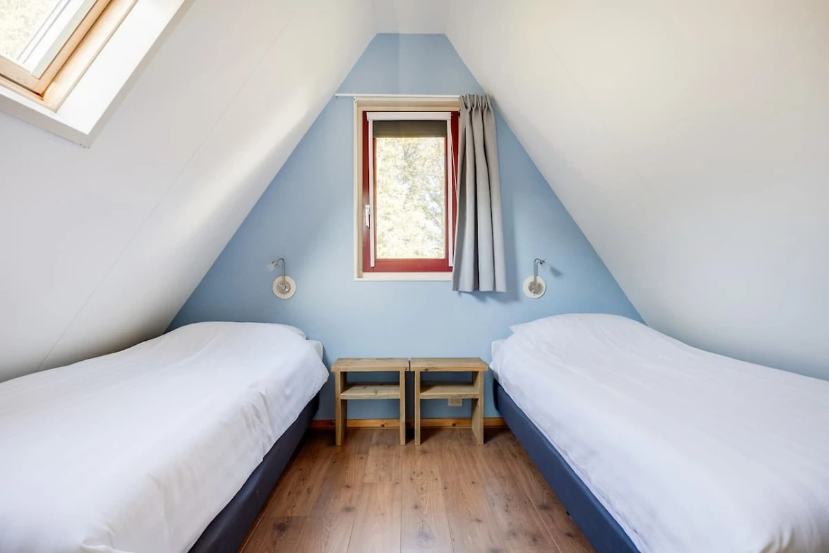 Im Obergeschoss bieten zwei komfortable Zweibettzimmer mit Boxspringbetten eine erholsame Atmosphäre. Zusätzlicher Stauraum im Kleiderschrank und ein überdachter Balkon – ideal, um den Morgenkaffee in Ruhe zu genießen – runden das Angebot ab. Praktische Annehmlichkeiten wie WLAN und eine Waschmaschine machen längere Aufenthalte besonders komfortabel. Der Park bietet zahlreiche weitere Einrichtungen wie ein Hallenbad, eine Minigolfanlage, einen privaten Angelsteg und vieles mehr.