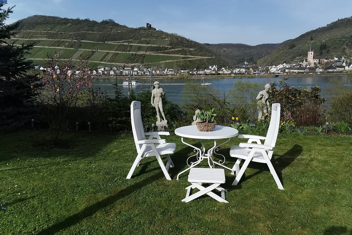 Hallo, ich freue mich, daß Sie sich meine Ferienwohnung anschauen. Diese liegt mitten im Weltkulturerbe Oberes Mittelrheintal auf der linken rheinseite kurz vor Bacharach. Ich vermiete seit 20 Jahren an Gäste aus Deutschland, den Niederlanden und aus Dänemark, wovon viele regelmäßig ihren Rheinurlaub bei mir verbringen. Es ist eine liebgewordene Traditiion, daß ich meine Gäöste persönlich willkommen heiße und neuen Gästen auch alles persönlich erkläre. Fahrpläne der weißen Schiffe und Infomaterial über die schönsten Ausflugsziele wie auf die Loreley, in die Drosselgasse nach Rüdesheim, zum Hildegardforum und Burg Klopp nach Bingen, zum Gutenbergmuseum nach Mainz, zum Deutschen Eck mit Kaiser Wilhelm nach Koblenz, in die Flußtäler der Mosel, der Nahe und der Ahr, all diese liegen in der Ferienwohnung bereit. Natürlich steht auch ein edler Tropfen aus der Region zum Anstoßen auf einen wunderschönen Rheinurlaub für Sie auf dem Tisch. Vom Balkon aus schauen Sie auf das Rheintal, auf die Weinberge gegenüber, die Burgen, und wie überall am Rhein fahren hier auch die Züge vorbei. Wenn Sie Fragen haben, beantworte ich Ihnen diese gerne vorab am Telefon.