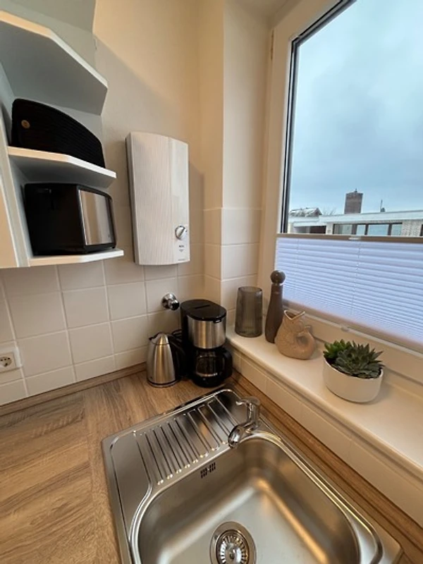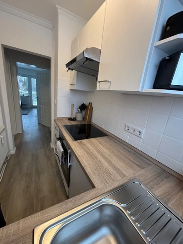 Die Einbauküche beinhaltet einen Backofen, Kühlschrank mit integriertem Gefrierfach, Geschirrspüler, Kaffeemaschine, Toaster, Wasserkocher und sehr viel Geschirr.
