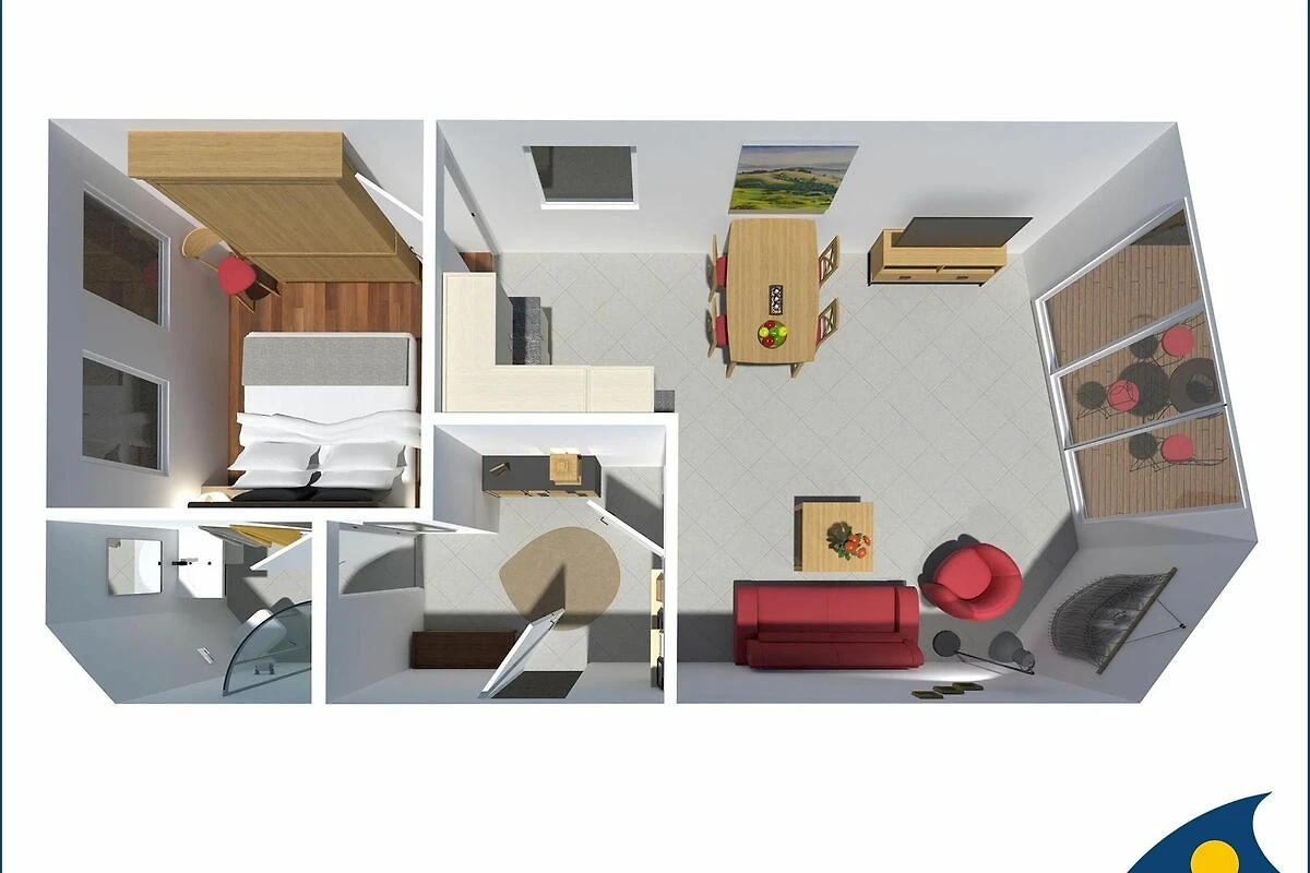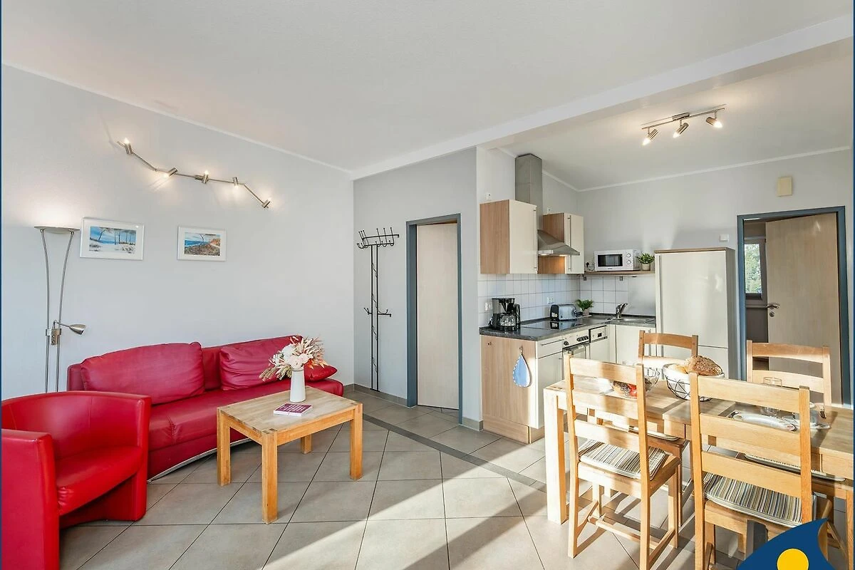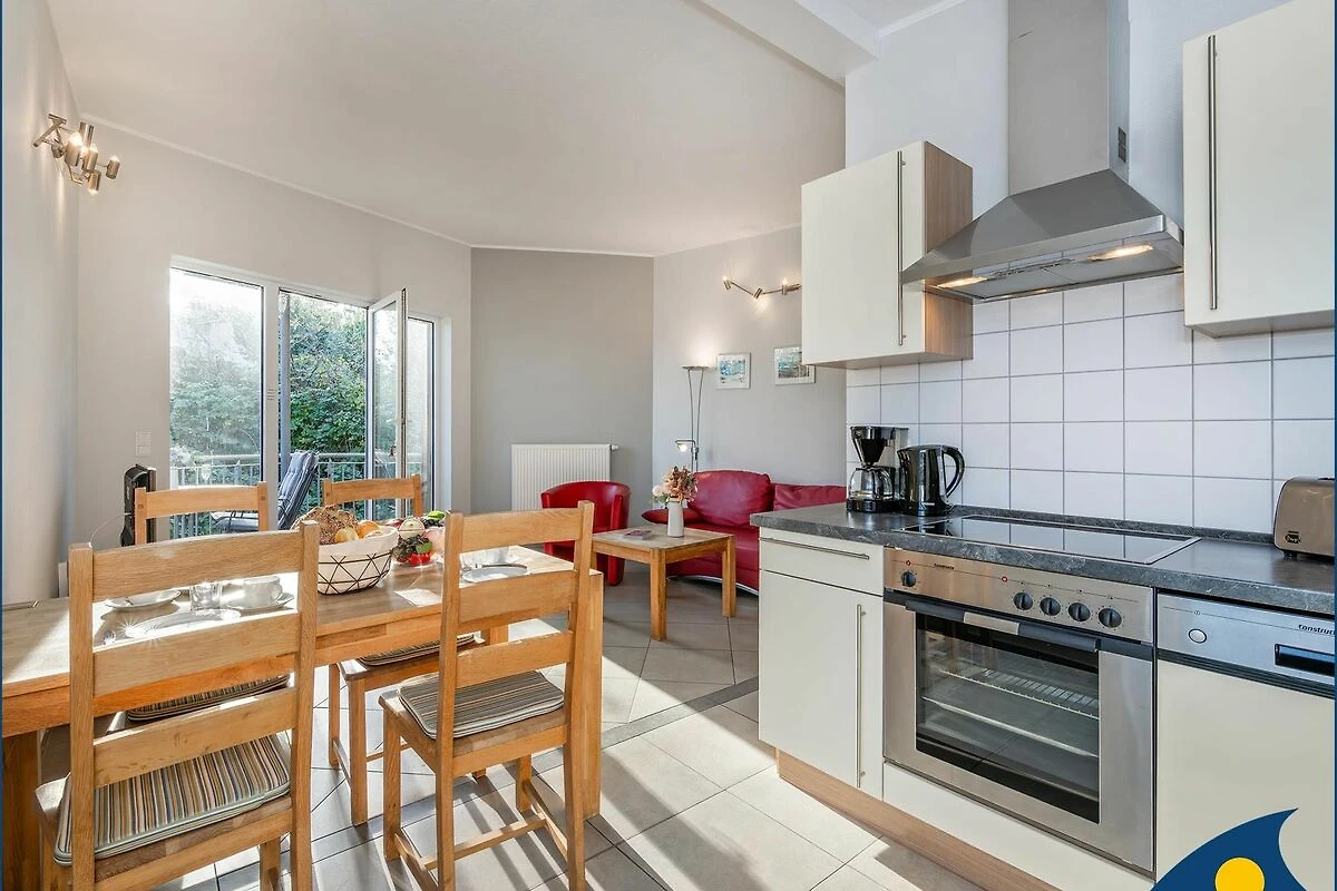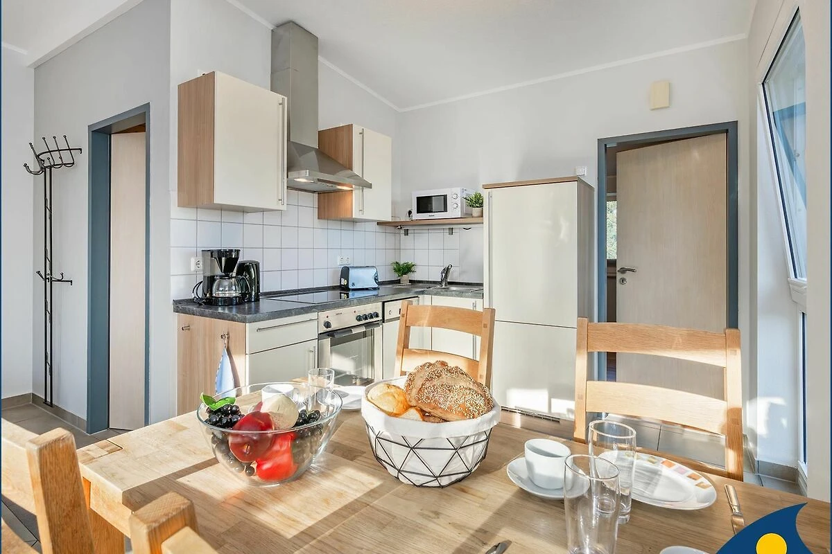 Der Wohnbereich mit offener Küche lädt zum Verweilen ein. Hier stehen eine gemütliche Schlaffunktionscouch, ein TV-Gerät sowie ein Radio/CD-Player zur Verfügung. Die komplett ausgestattete Küche bietet alle wichtigen Geräte und Utensilien für die Zubereitung gemeinsamer Mahlzeiten. Vom Wohnbereich aus gelangen Sie auf den Balkon perfekt für eine entspannte Pause an der frischen Ostseeluft.