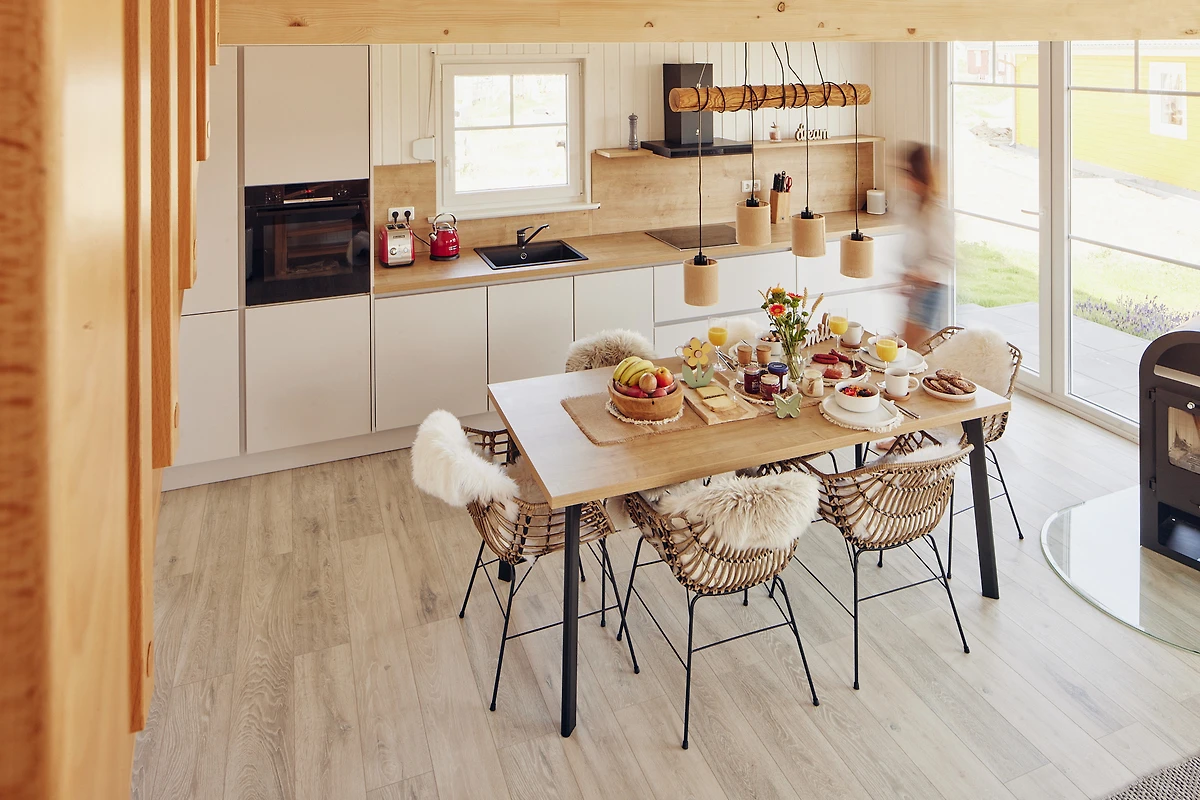 Das Herzstück des Hauses bildet der offene Wohnbereich mit Kamin, der an kühlen Tagen für wohlige Wärme sorgt. Für Wellnessliebhaber gibt es eine Sauna sowie einen Hot Tub Whirlpool, die nach langen Ausflügen zur Erholung einladen. Die voll ausgestattete Küchenzeile mit Geschirrspüler, Wasserkocher und Kaffeemaschine lässt keine Wünsche offen, gemeinsames Kochen wird hier zum Vergnügen. Bettwäsche ist selbstverständlich vorhanden, ebenso wie TV und Highspeed-WLAN für entspannte Abende.