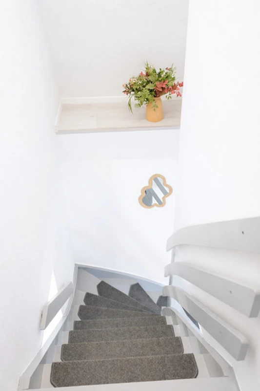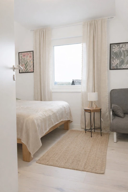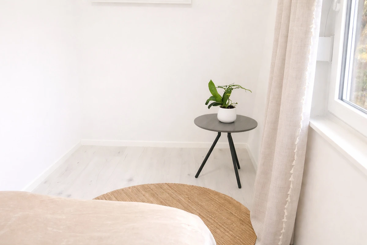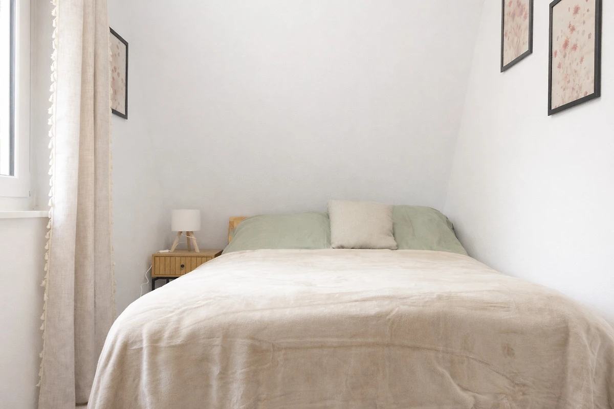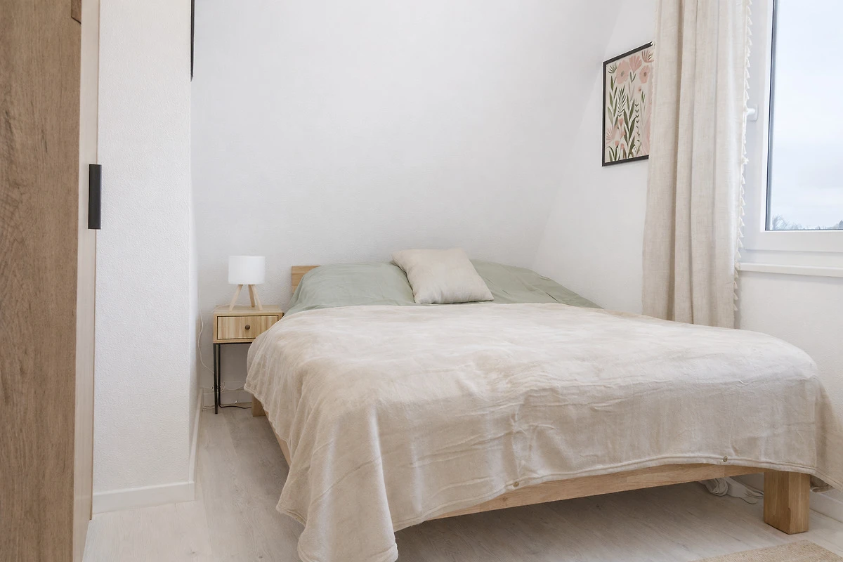 Zwei behagliche Schlafzimmer mit hochwertigen Matratzen sorgen für erholsamen Schlaf. Alle Räume verfügen über Außenrollos für optimale Verdunkelung.