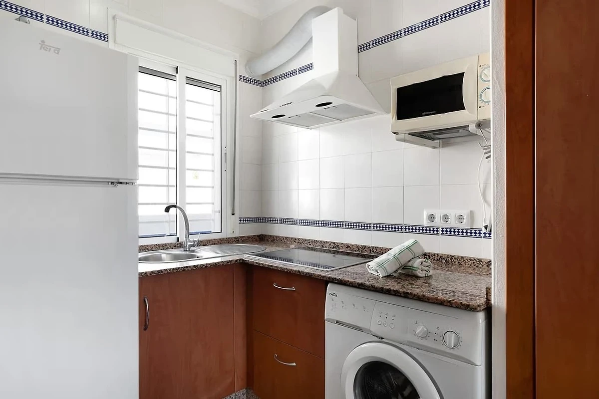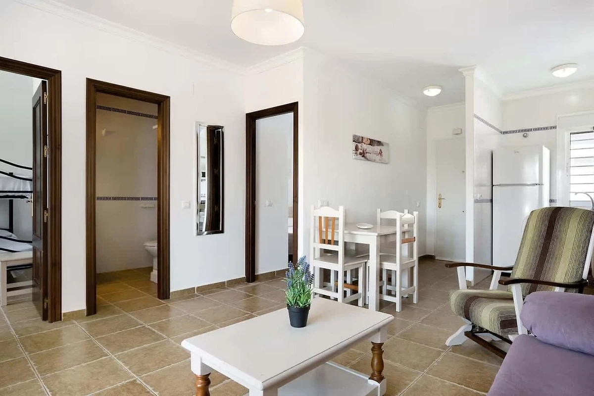 Dieses gemütliche Apartment bietet einen komfortablen Rückzugsort für zwei Gäste und ist somit die ideale Wahl für Paare, die einen einfachen und entspannten Aufenthalt in Südspanien suchen. Das Wohnzimmer verfügt über einen Flachbildfernseher, einen Esstisch und eine gemütliche Sitzecke und schafft so einen einladenden Raum, um sich nach einem erlebnisreichen Tag zu entspannen.