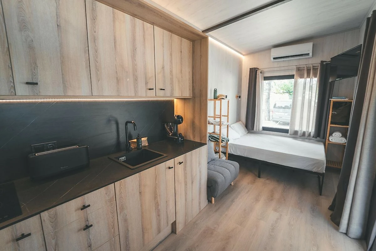 Im Inneren ist das Minihaus durchdacht eingerichtet, um den intimen Raum optimal zu nutzen. Ein komfortables Doppelbett sorgt für erholsame Nächte, während die offene Küche mit Kochfeld es Ihnen ermöglicht, jederzeit einfache, selbstgekochte Mahlzeiten zuzubereiten. Große Fenster lassen viel Tageslicht herein und verleihen dem Raum eine offene und ruhige Atmosphäre. Die Terrasse wird zu Ihrem Wohnzimmer im Freien, wo Sie entspannen, sonnenbaden, lesen oder unter freiem Himmel speisen können. Klein, charmant und voller Wärme – perfekt für Paare, die Einfachheit und Komfort lieben.