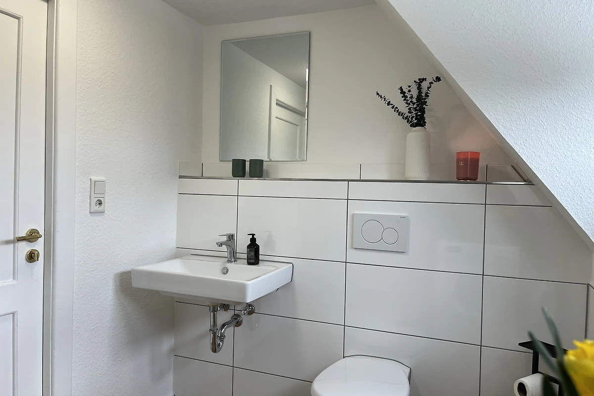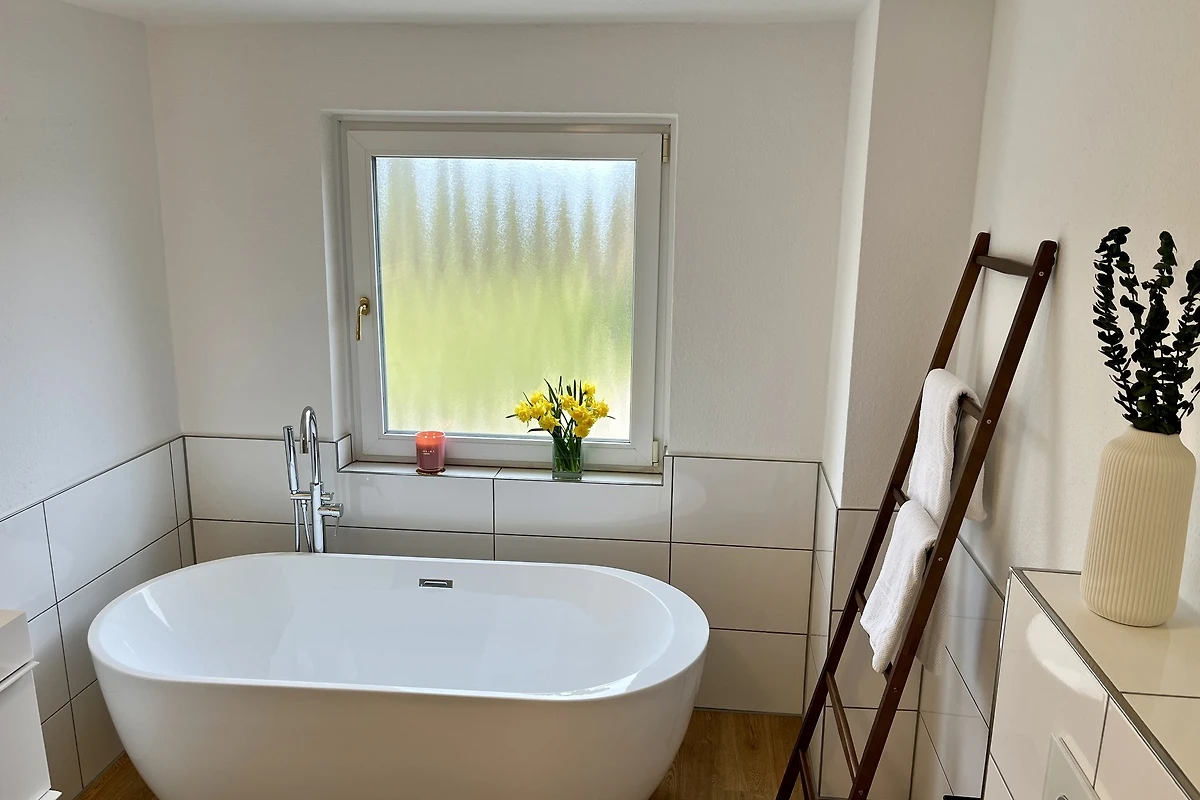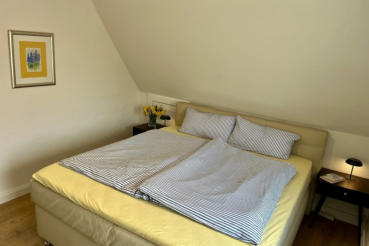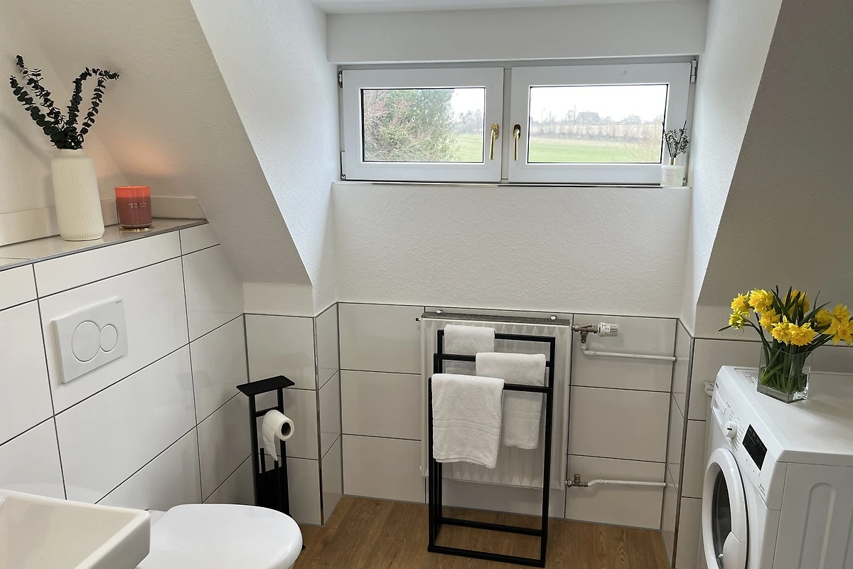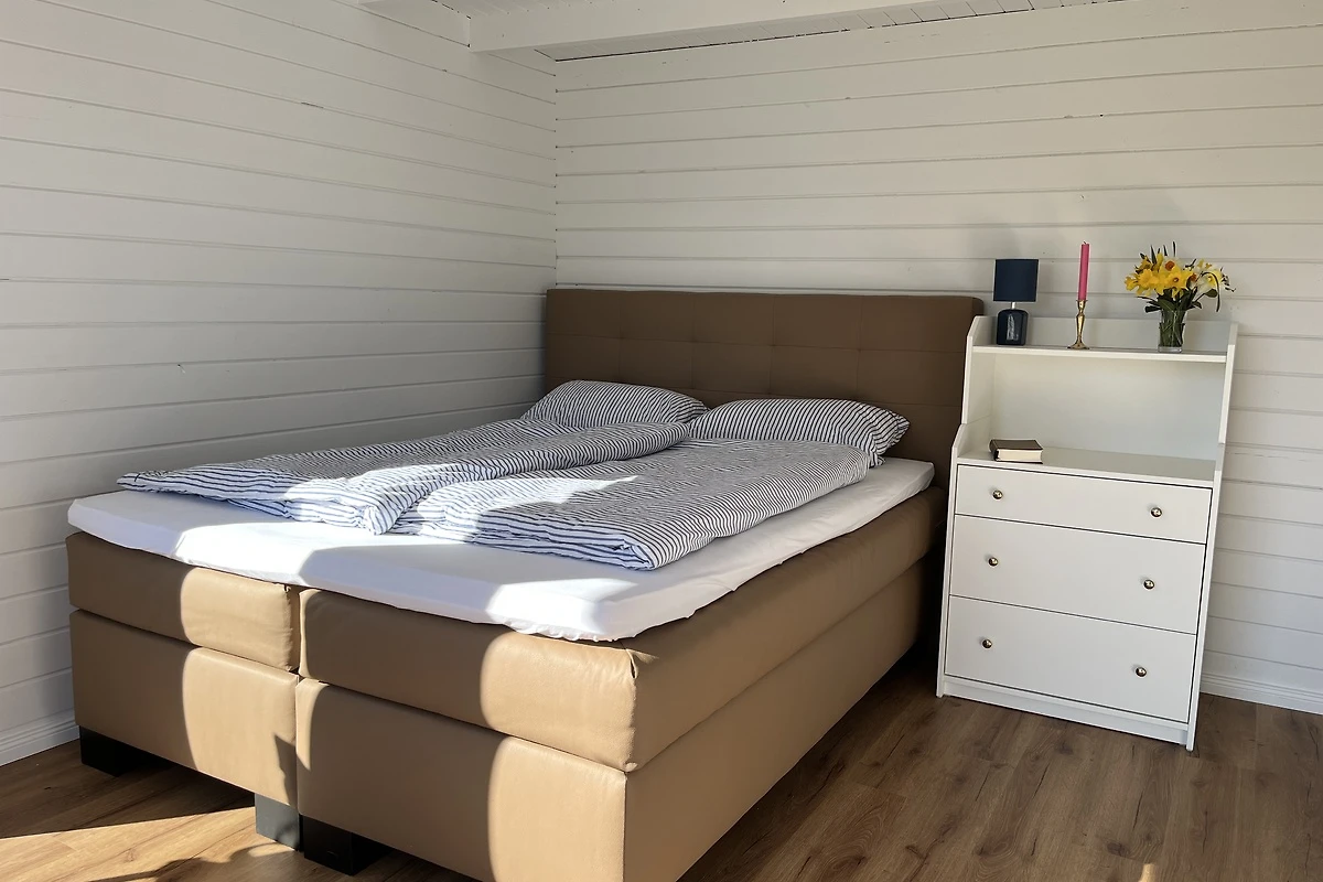 Das Ferienhaus bietet im Erdgeschoss einen großzügigen, offenen Wohn- und Essbereich mit gut ausgestatteter Küche, Kamin und direktem Gartenzugang sowie ein modernes Vollbad mit Fußbodenheizung, freistehender Badewanne und ebenerdiger Dusche. Im Obergeschoss befinden sich zwei helle, gemütliche Schlafzimmer mit Boxspringbetten und ein weiteres modernes Vollbad mit Waschmaschine.