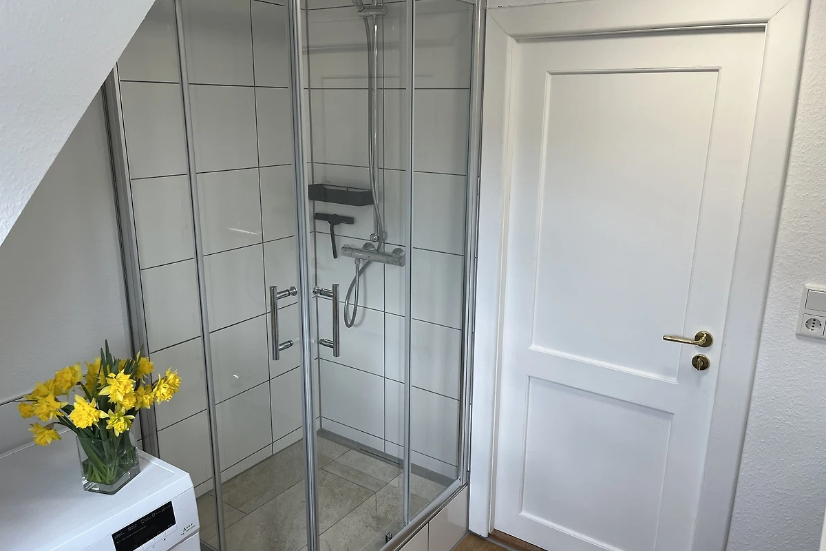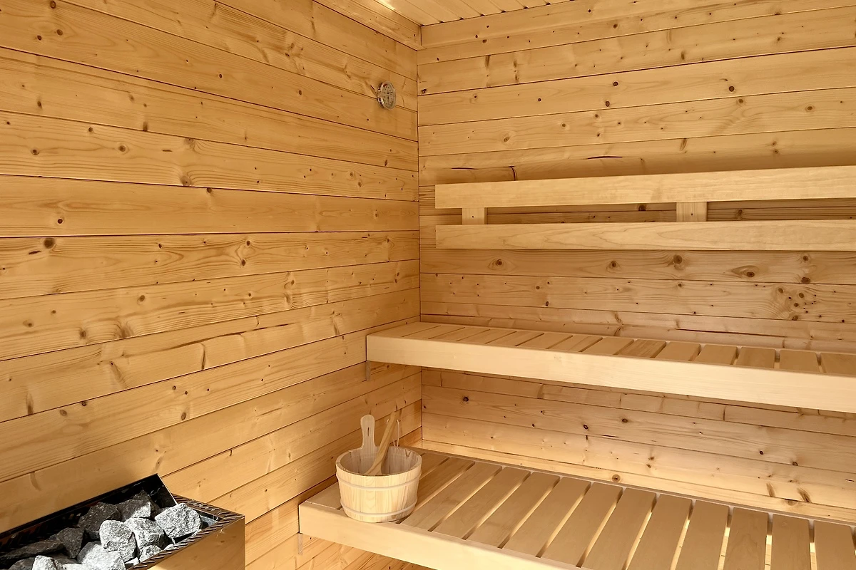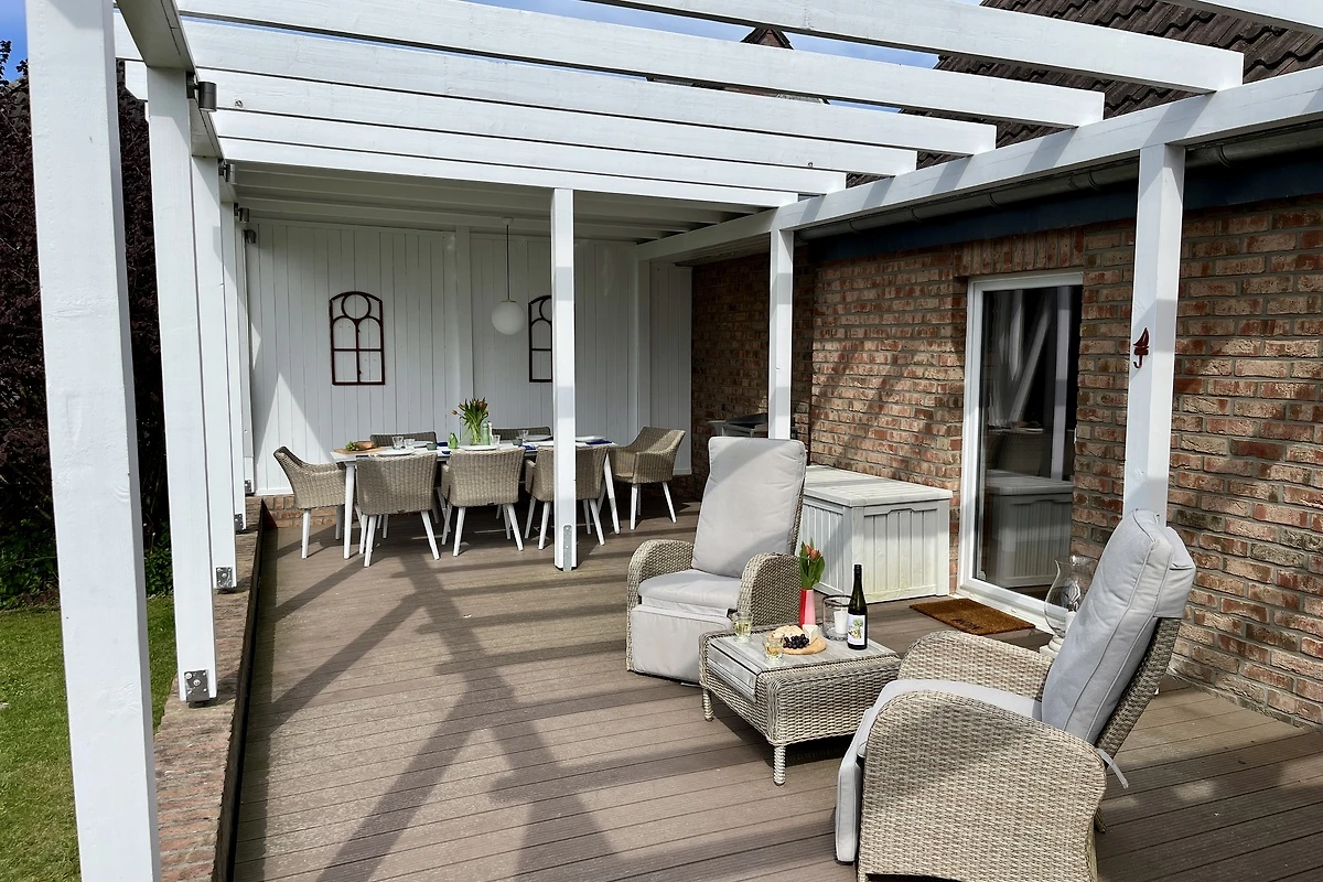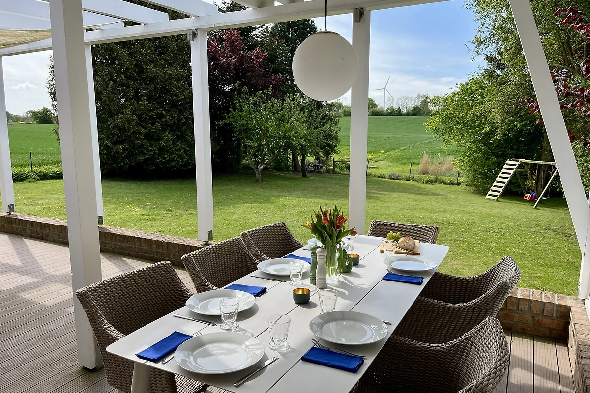 Das Highlight des Hauses ist die riesige Südterrasse mit überdachtem Ess- und Grillbereich sowie Sonnenliegen, die zum Sonnenbaden und Entspannen mit herrlichem Feldblick einlädt. Die Terrasse lässt sich beleuchten und ermöglicht so auch gemütliche Abendstunden bis in die Nacht hinein. Neben der Terrasse befindet sich ein neues und modernes Saunahaus, das bequem direkt vom Haus über die Terrasse zugänglich ist.