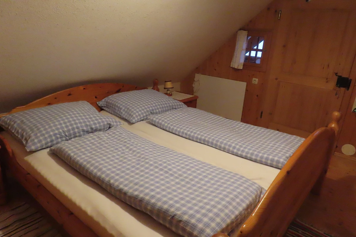 Das Schlafzimmer mit Doppelbett (und angrenzendem WC) liegt im 1. Stock und ist nur über die Außentreppe erreichbar.