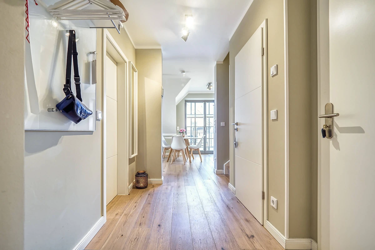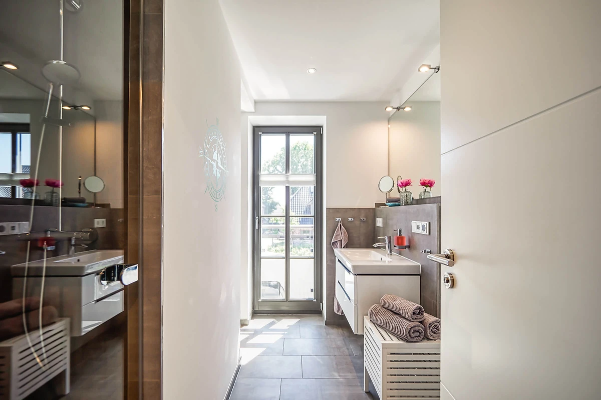 Nach einem langen Tag an der frischen Ostseeluft bietet die bodentiefe Raindance-Dusche eine erfrischende Möglichkeit, zu entspannen. Der windgeschützte Balkon ist der perfekte Ort, um den Tag mit einem Frühstück zu beginnen oder abends die letzten Sonnenstrahlen zu geniessen. Für Radfahrer steht ein abschliessbares Fahrraddepot mit E-Bike-Lademöglichkeit zur Verfügung.