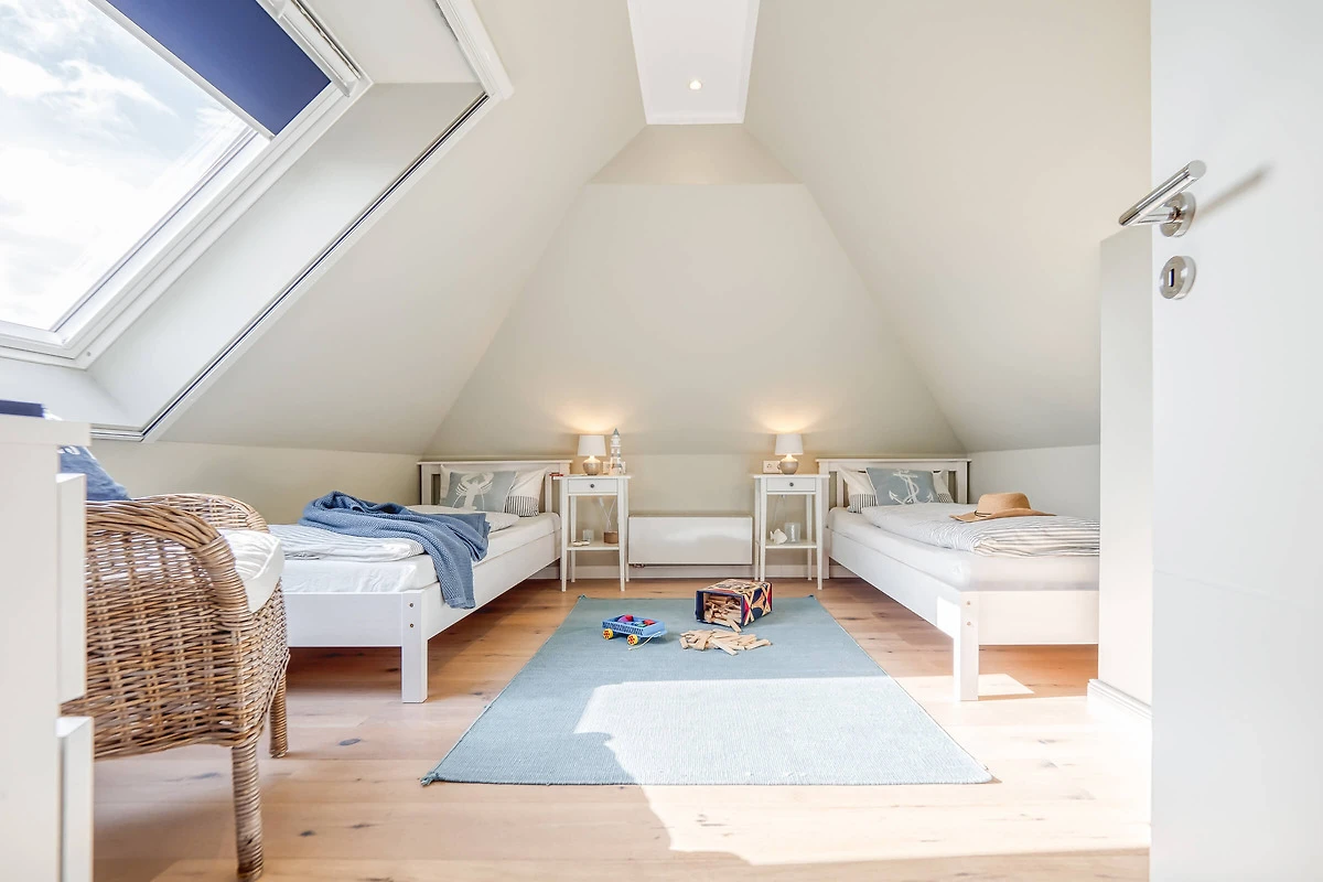 Zwei Schlafzimmer: Ein Schlafzimmer mit luxuriösem Boxspringbett und ein Dachgeschosszimmer mit zwei Einzelbetten