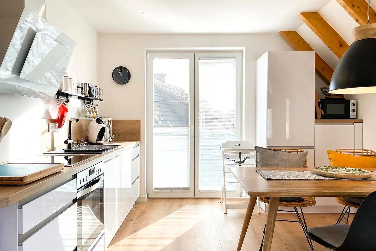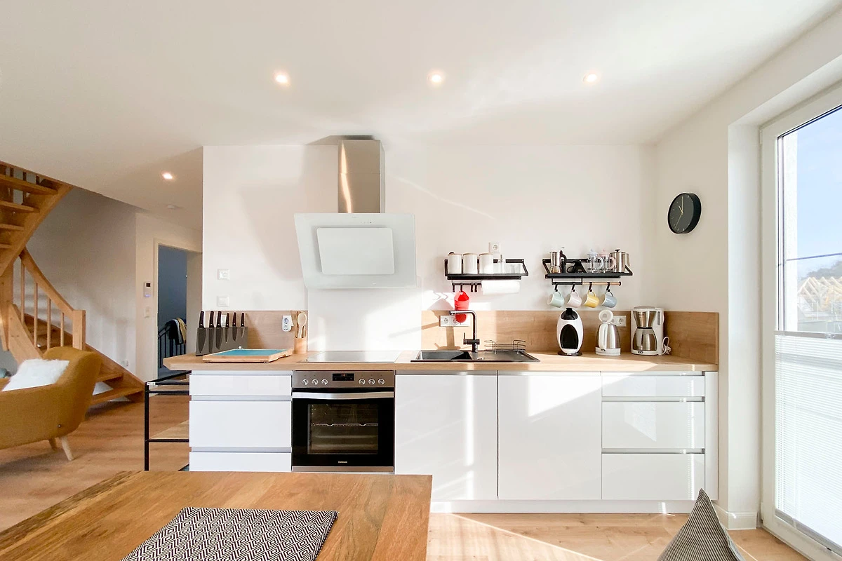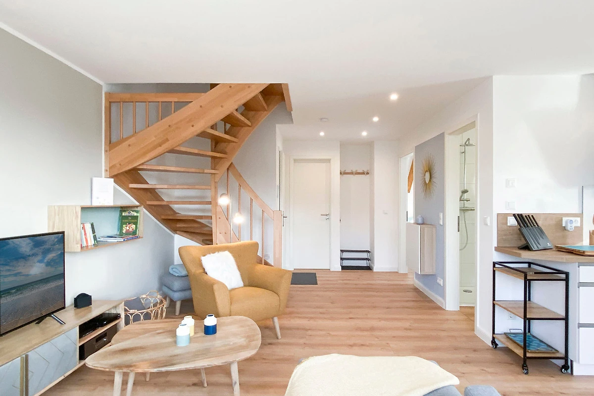 Das Beach Loft vereint modernes Wohnen mit maritimem Charme. Die offene Architektur mit grosszügigen Fensterfronten sorgt für ein helles, freundliches Ambiente – ideal, um den Alltag hinter sich zu lassen. Im ersten Obergeschoss befindet sich der weitläufige Wohn- und Essbereich mit einer voll ausgestatteten Küche, die keine Wünsche offenlässt. Hier entstehen kulinarische Lieblingsmomente mit Meerluft in der Nase.