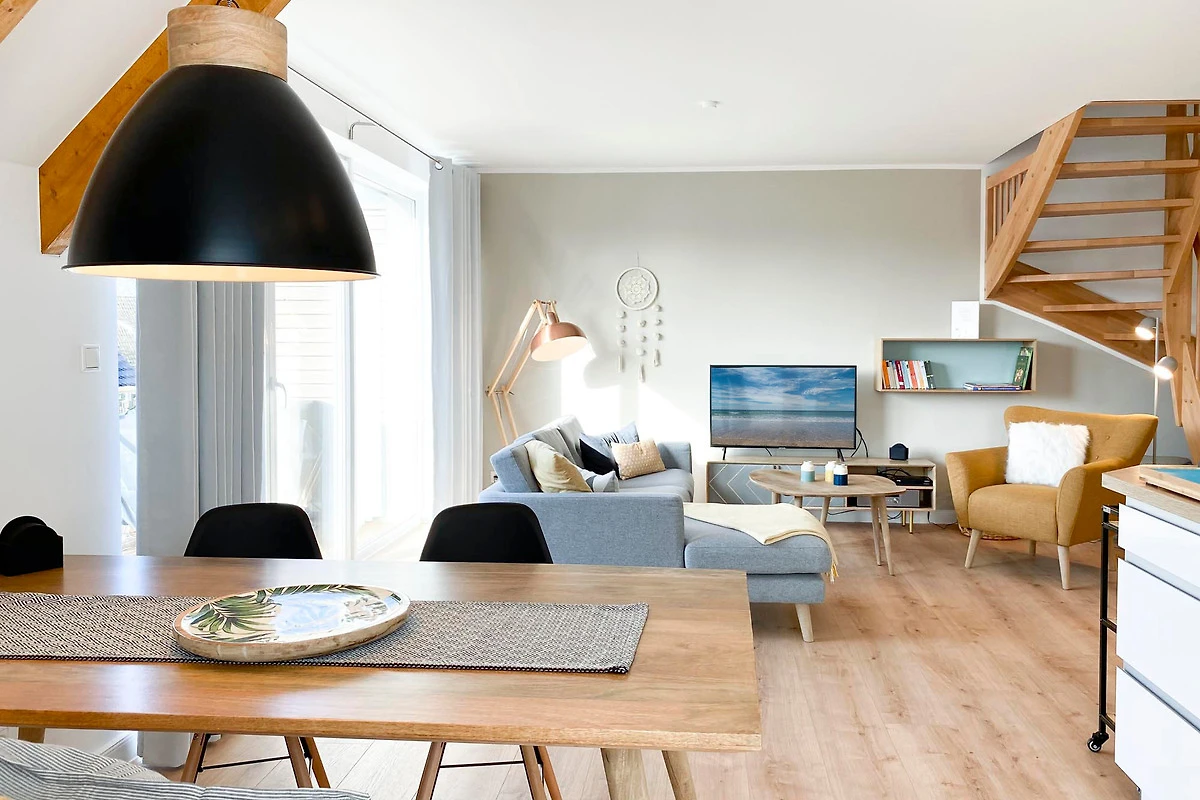 Willkommen im Beach Loft in Zingst – Ihrem stilvollen Rückzugsort zwischen Dünen, Sonne und Meer! Nur 100 Meter vom feinsandigen Ostseestrand entfernt, erwartet Sie diese exklusive Maisonette-Wohnung im Haus Strandidyll. Auf 80 m² geniessen bis zu vier Personen und ein Kleinkind modernen Komfort, durchdachtes Design und das unverwechselbare Gefühl von Freiheit, das nur die Nähe zum Meer schenken kann.
