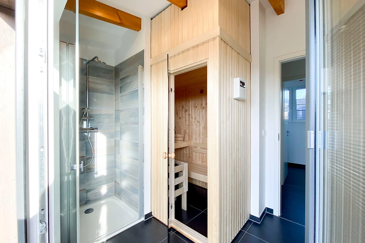 Über eine offene Holztreppe gelangen Sie ins Dachgeschoss – Ihre private Wohlfühloase. Hier erwarten Sie eine Sauna, ein weiteres Schlafzimmer mit sichtbaren Dachbalken und ein zweites Bad. Vom oberen Balkon geniessen Sie den Blick in den Himmel und die salzige Meeresbrise – ein Ort zum Durchatmen und Entspannen.