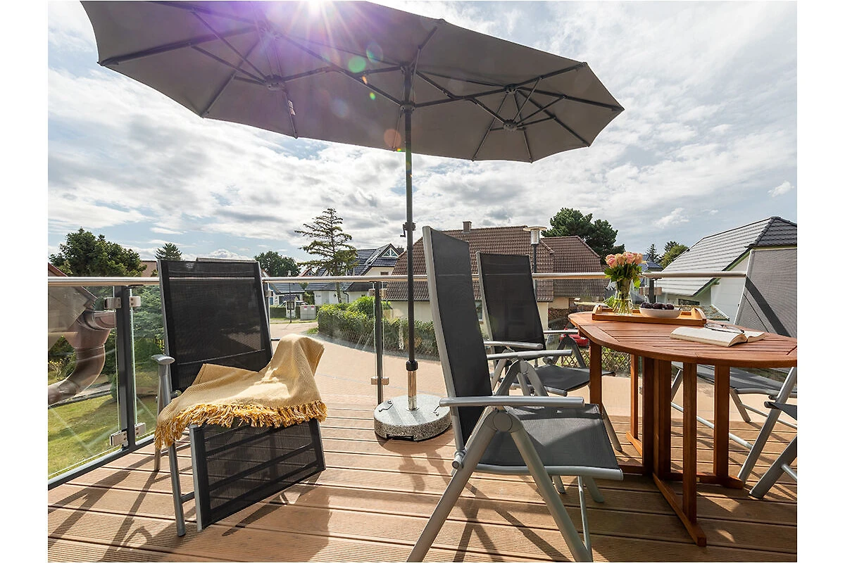 Ein Schlafzimmer mit Doppelbett und ein elegantes Badezimmer mit bodengleicher Regendusche ergänzen diese Ebene. Der sonnige Balkon in Süd-/Westlage lädt zu gemütlichen Stunden ein – ob beim Frühstück in der Morgensonne oder beim Sundowner im Abendlicht.