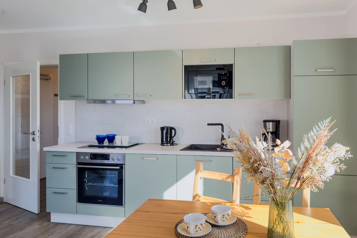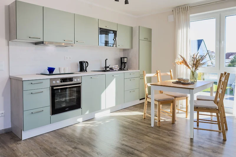 Küche und Essbereich: Voll ausgestattete Küche mit Backofen, Kochfeld, Geschirrspüler, Kühlschrank, Filterkaffeemaschine, Toaster und Wasserkocher. Die angrenzende Essgruppe lädt zu geselligen Mahlzeiten ein.
