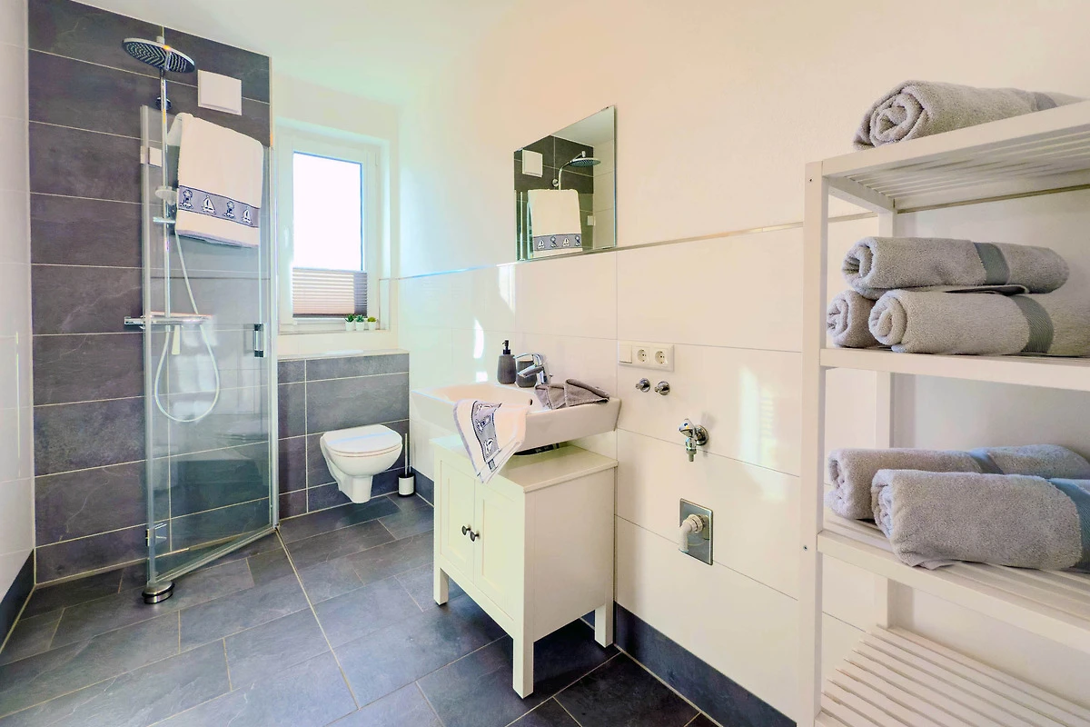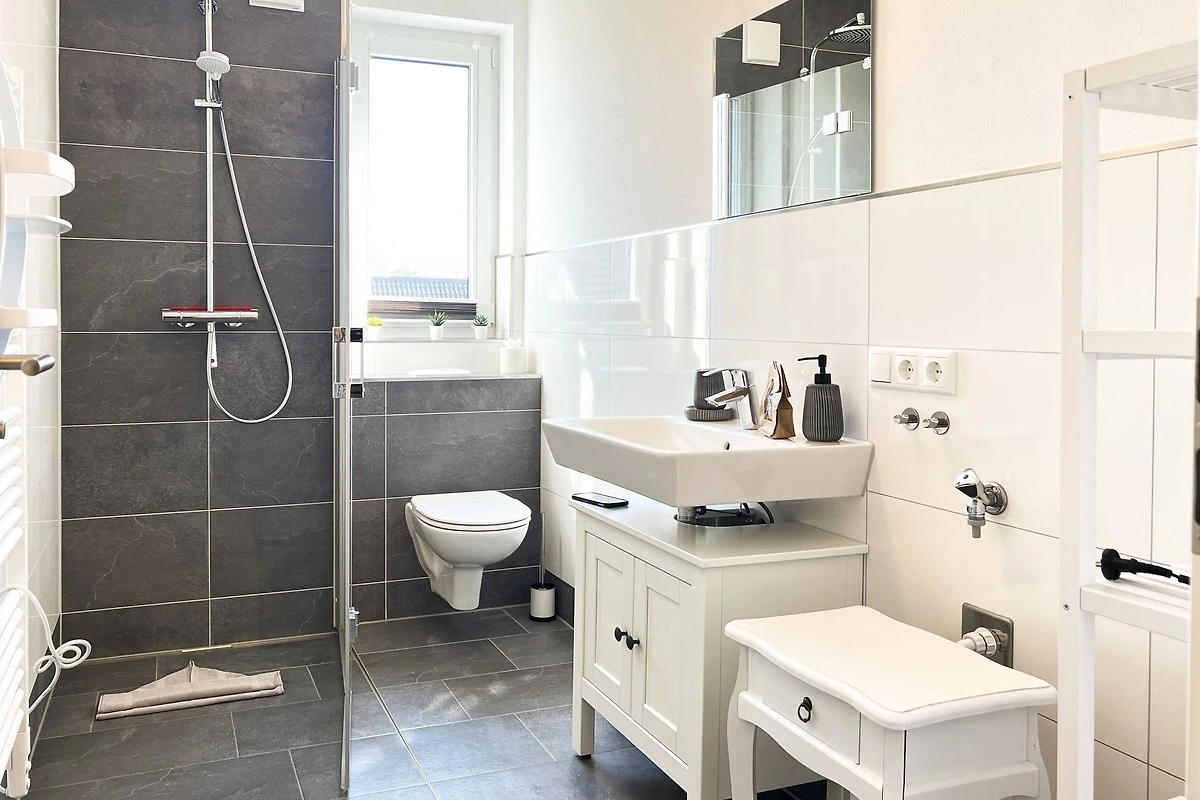 Badezimmer: Modernes Bad mit bodentiefer Dusche, WC, Haartrockner und Fussbodenheizung für zusätzlichen Komfort.