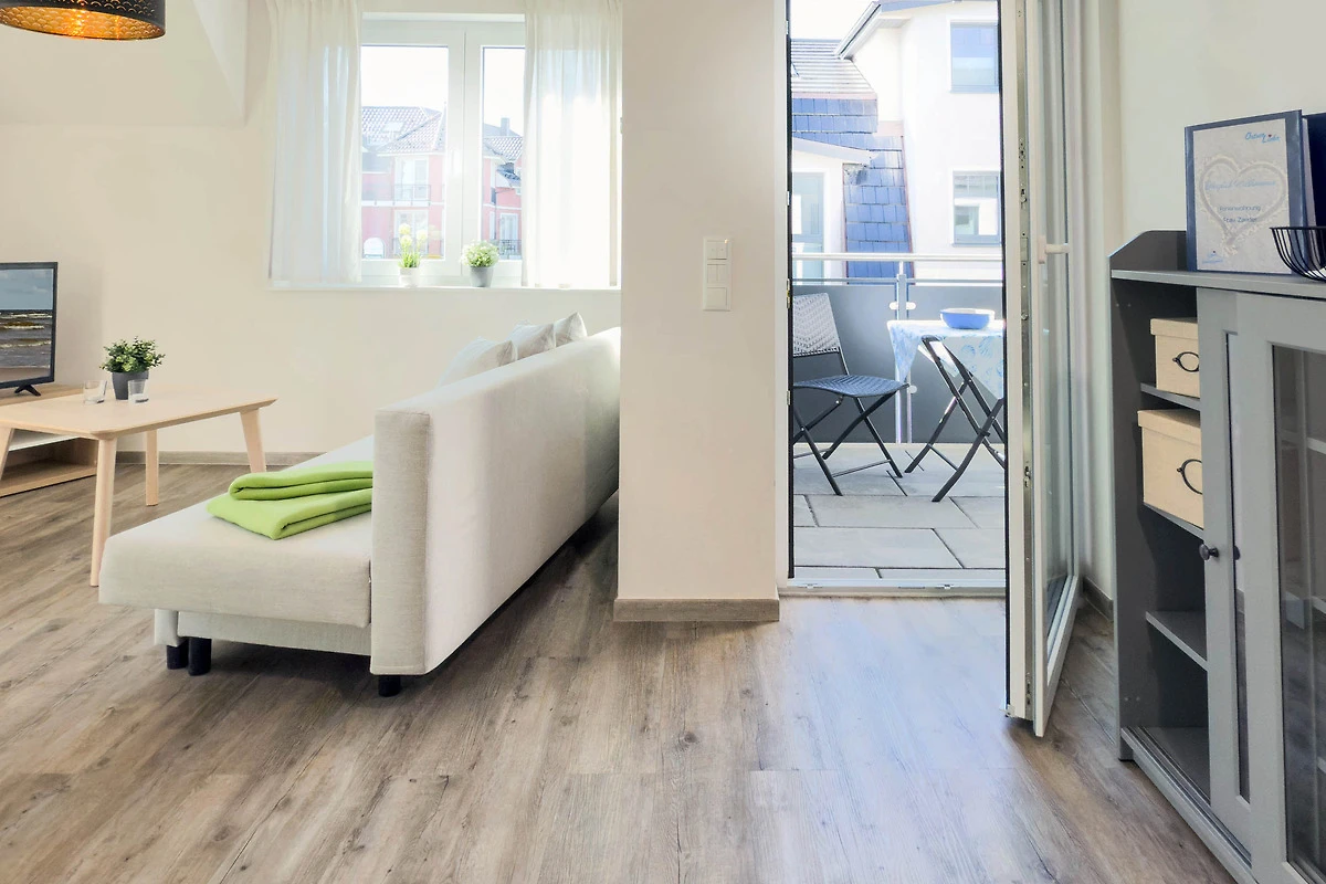 Wohnbereich: Heller Wohnraum mit bequemer Sitzgruppe, Smart-TV und Zugang zum Balkon für entspannte Stunden.
