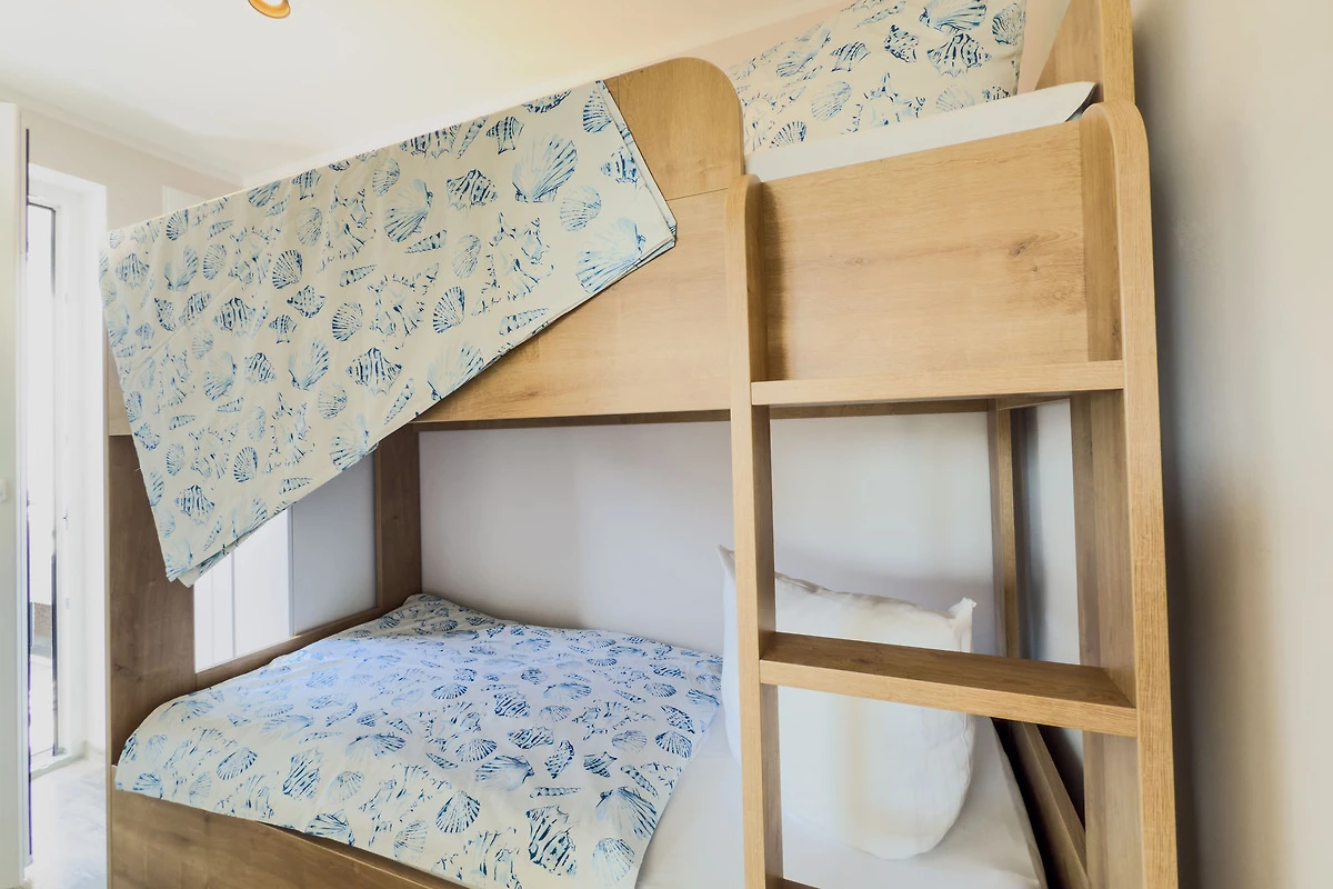 Schlafzimmer: Zwei separate Schlafzimmer – eines mit Doppelbett, das andere mit Etagenbett – garantieren erholsame Nächte für alle Gäste.