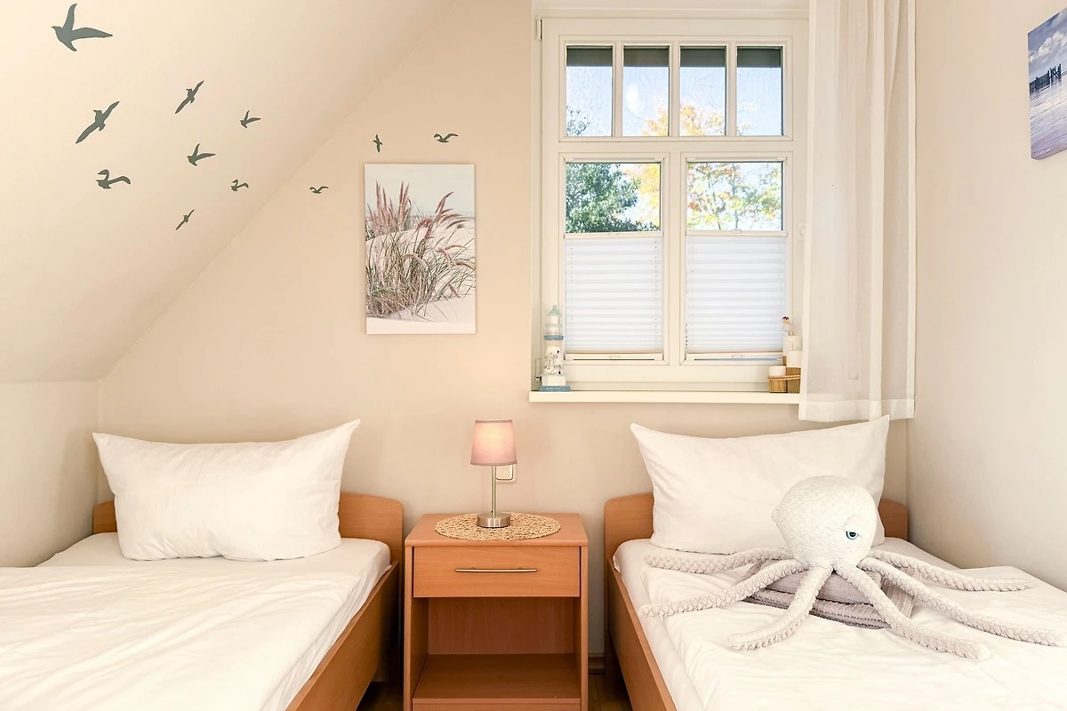 Die ruhig gelegene Doppelhaushälfte liegt nur 300 m vom feinsandigen Ostseestrand entfernt und bietet auf 90 m² Wohnfläche über zwei Etagen ausreichend Platz für bis zu 6 Personen und ein Kleinkind.