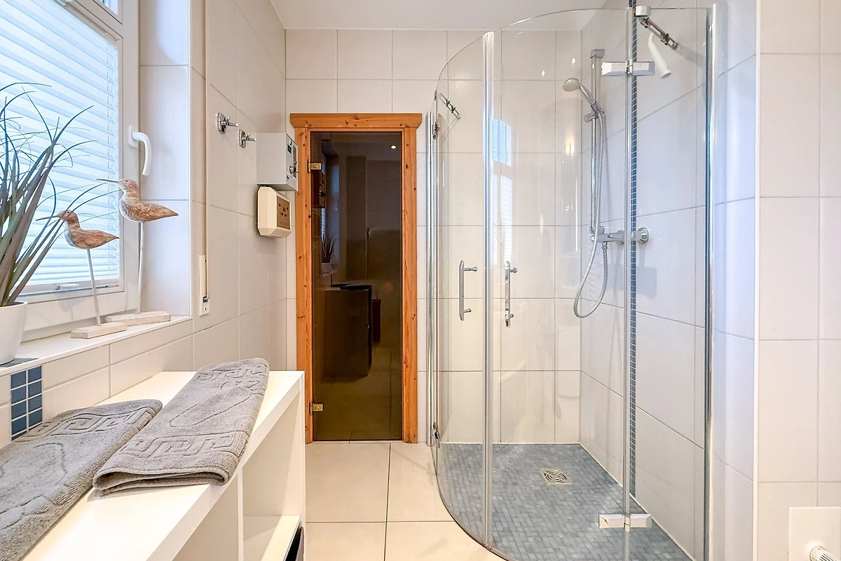 Nach einem Spaziergang am Strand oder einem Ausflug zum Bodden wartet die hauseigene Sauna auf Sie – ein Ort wohltuender Entspannung, besonders an kühlen Herbst- und Wintertagen.