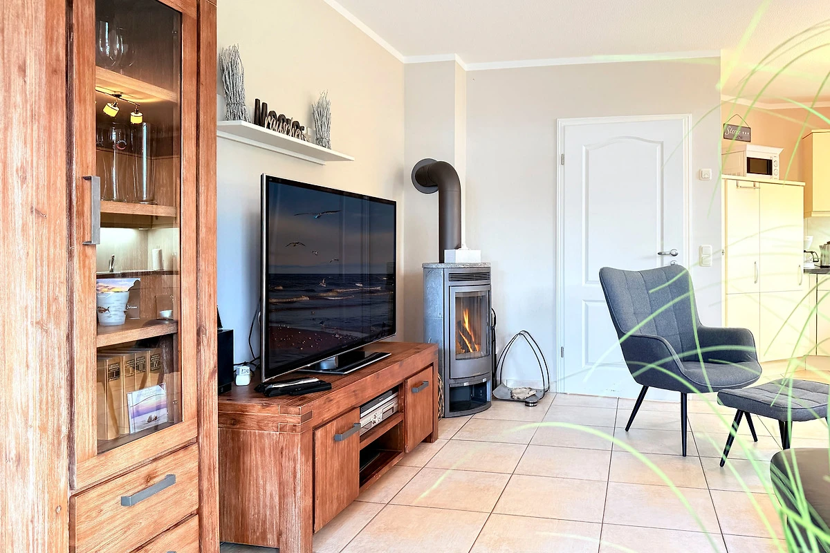 Heller Wohnbereich mit Kaminofen, LED-TV und Blu-ray-Player