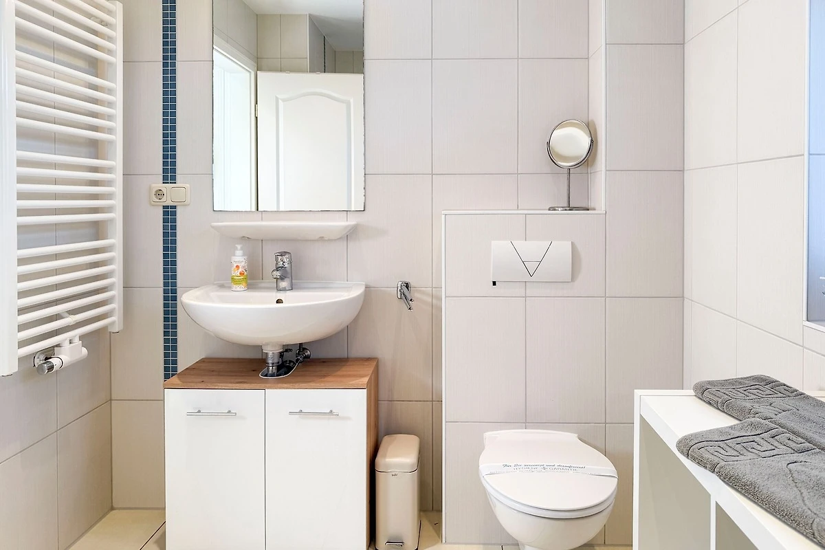 Zwei moderne Badezimmer mit Dusche, Fussbodenheizung und Haartrockner