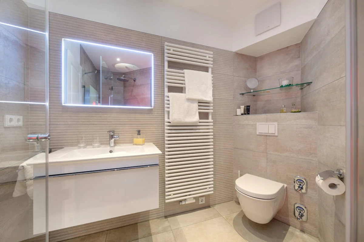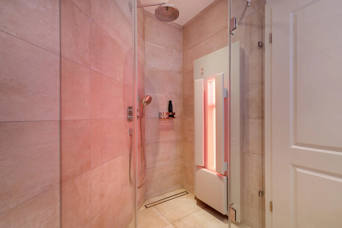 Badezimmer: Modernes Bad mit bodengleicher Duschkabine und Infrarot-Dusche von Physiotherm für zusätzlichen Komfort.