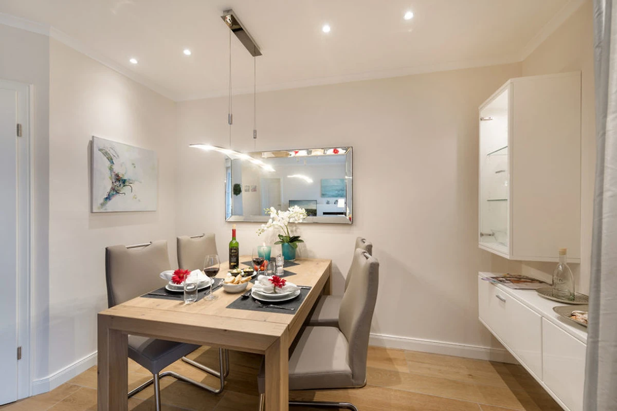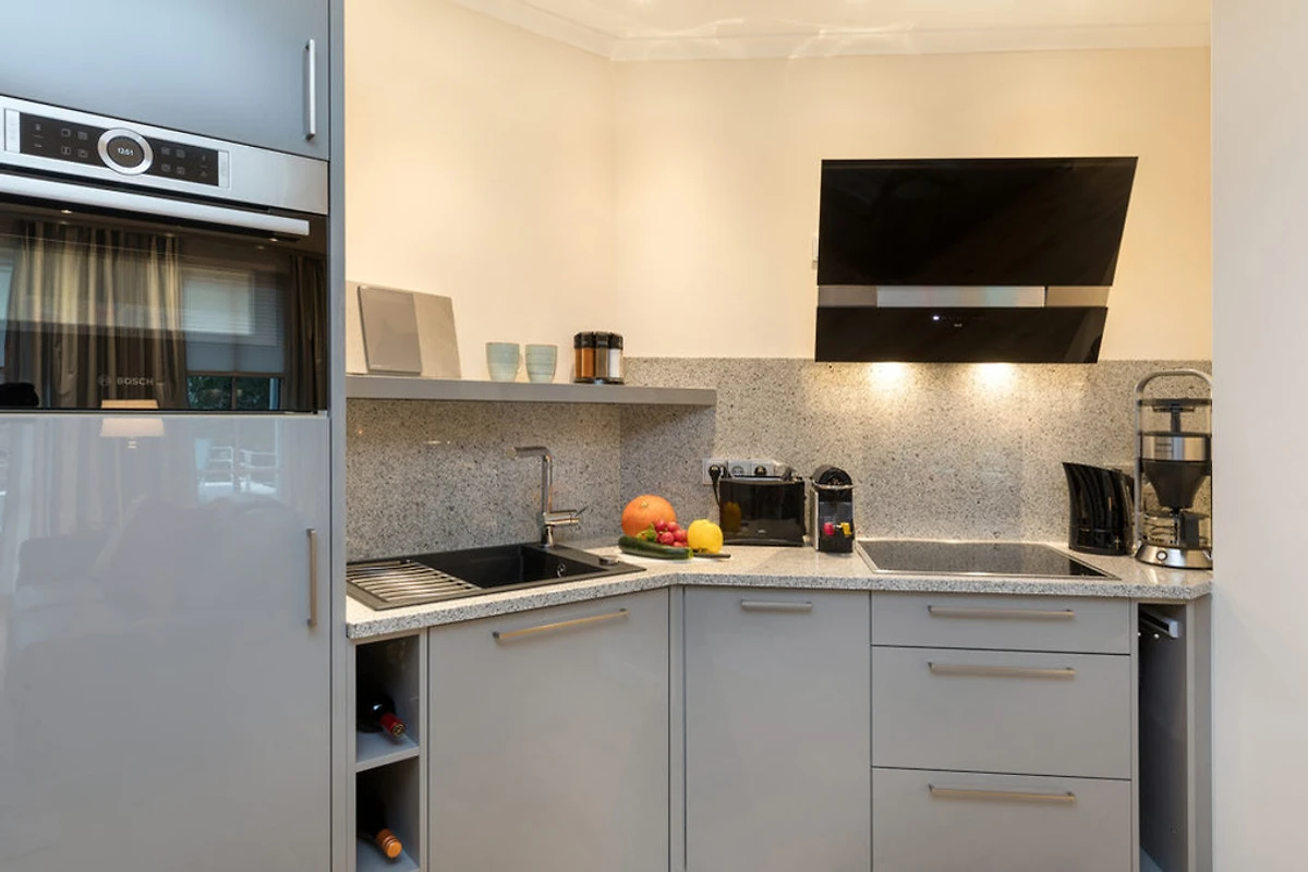 Küche und Essbereich: Offene, voll ausgestattete Küche mit Granit-Arbeitsplatte, Ceran-Kochfeld, Backofen mit integrierter Mikrowelle, Geschirrspüler, Kühlschrank mit Gefrierfach, Nespresso-Maschine, Filterkaffeemaschine, Toaster und Wasserkocher. Die angrenzende Essgruppe lädt zu geselligen Mahlzeiten ein.
