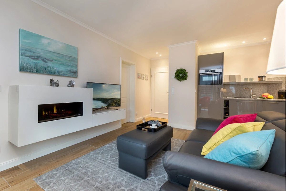 Wohnbereich: Heller Wohnraum mit bequemer Sitzgruppe, elektrischem Kamin, Flachbild-TV und Zugang zum Balkon für entspannte Stunden.