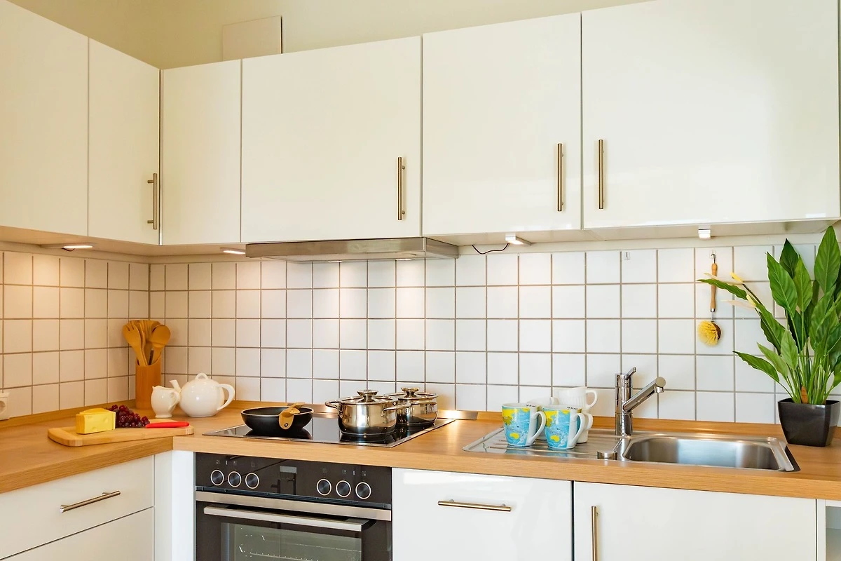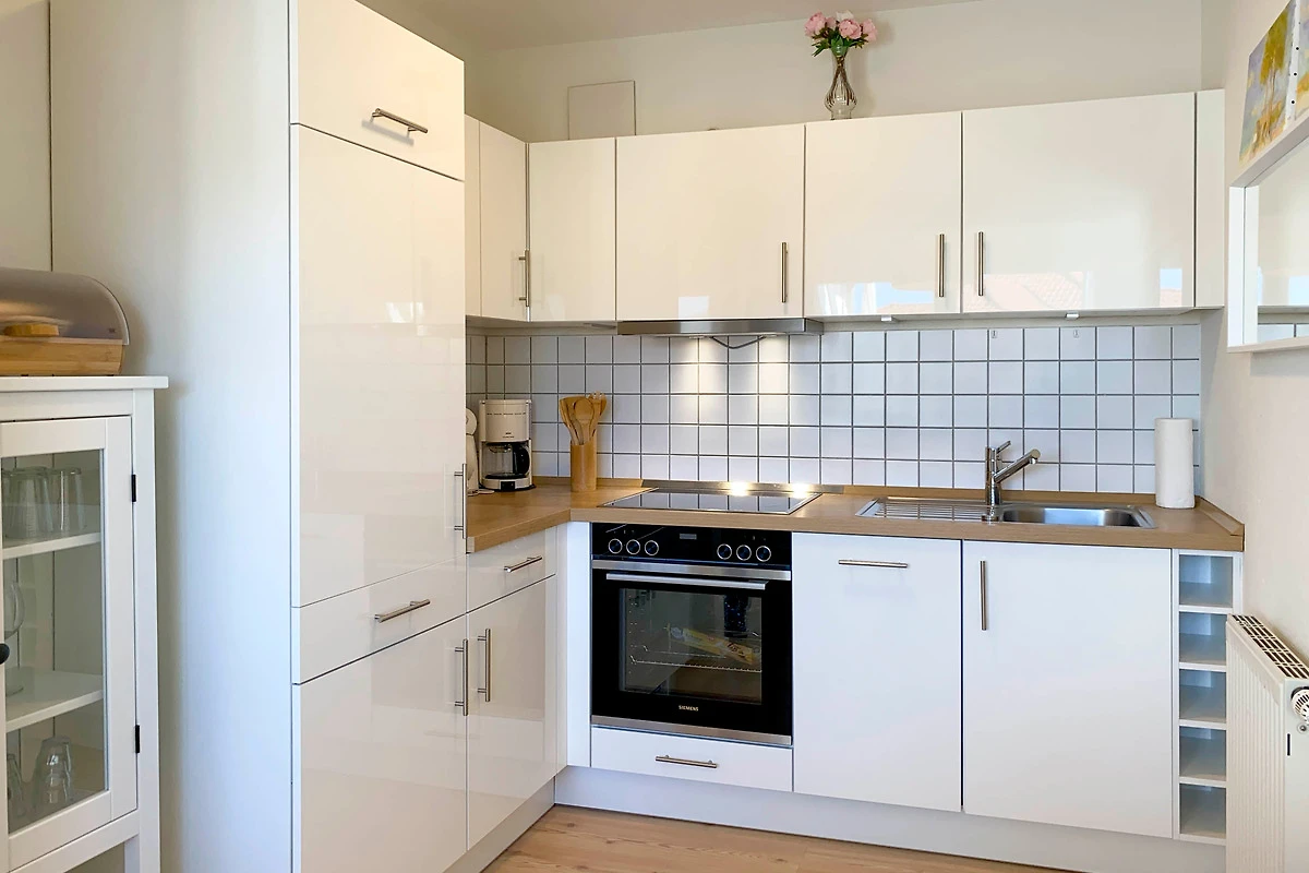 Küche und Essbereich: Offene, voll ausgestattete Küche mit Herd, Backofen, Toaster, Kaffeemaschine, Wasserkocher und Geschirrspüler. Der angrenzende Essbereich mit rundem Tisch und vier Stühlen lädt zu geselligen Mahlzeiten ein.