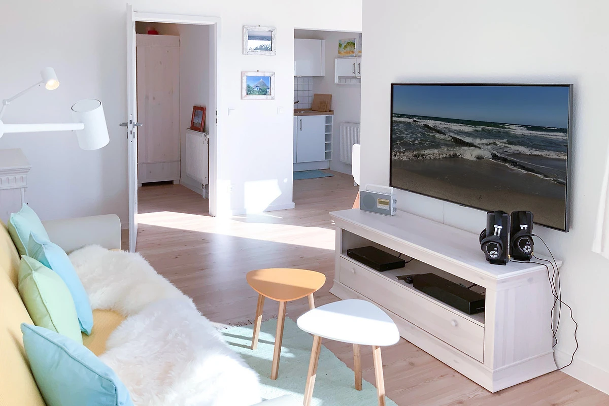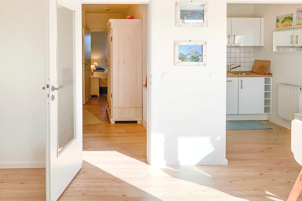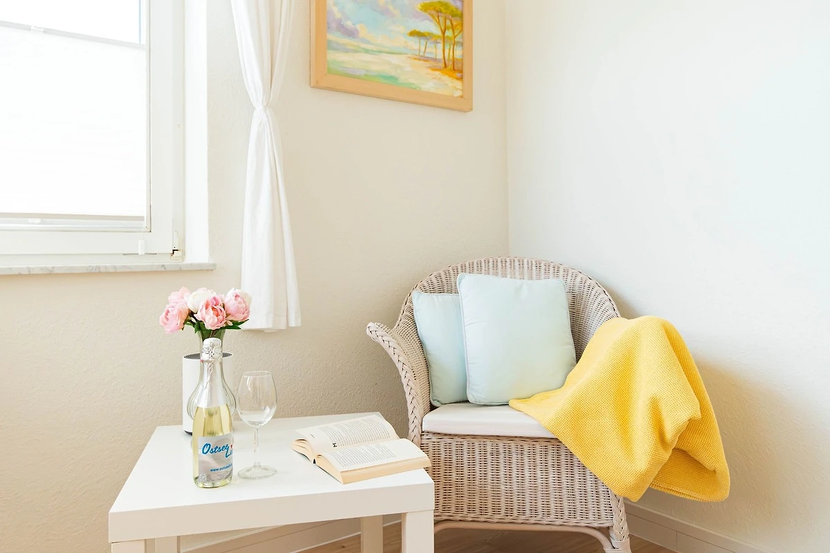 Die Ferienwohnung "Kranichflug" empfängt Sie mit einer harmonischen Kombination aus modernem Komfort und maritimem Ambiente. Der lichtdurchflutete Wohnbereich lädt zu entspannten Stunden ein, während die offene Küche mit allem ausgestattet ist, was Sie für Ihre Lieblingsgerichte benötigen. Geniessen Sie Ihre Mahlzeiten auf dem einladenden Balkon und lassen Sie den Tag in gemütlicher Atmosphäre ausklingen. Das moderne Badezimmer und das komfortable Schlafzimmer bieten zusätzlichen Komfort für erholsame Nächte.